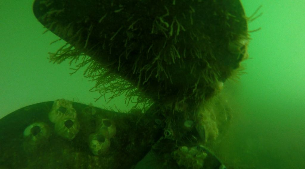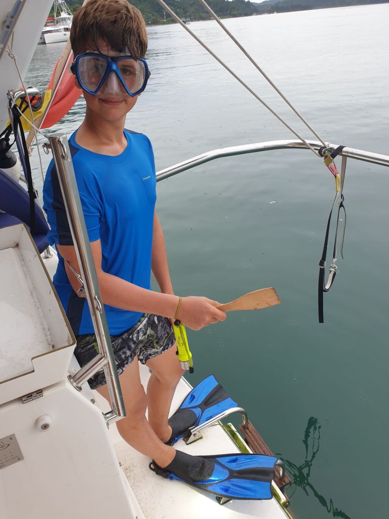 Die Pocken sind sehr zäh und wollen nicht abgekratzt werden. Zu allem Überfluss nutzt sich das Holz ab und gerade, als ich mein Ziel den Propeller erreicht habe, beginnt die Strömung und ich muss das Wasser verlassen. Wir liegen vor Anker und treiben an ihm hin und her. Mein Ziel war der Propeller, um ihn zu säubern, aber wie gesagt, begann die Strömung und es ging nicht.