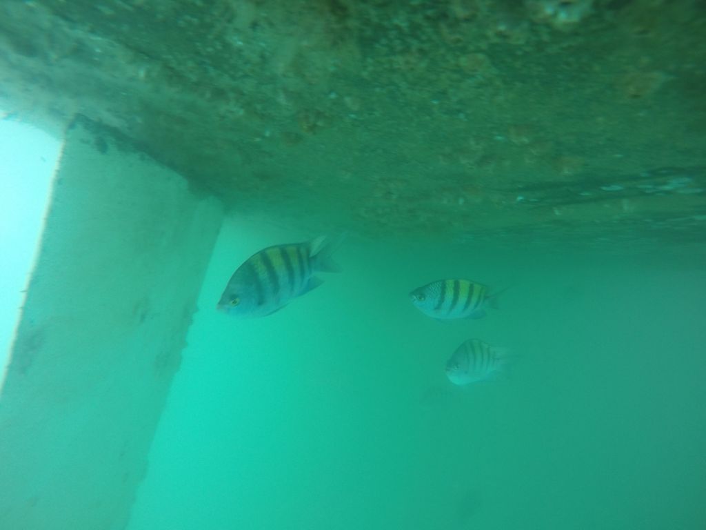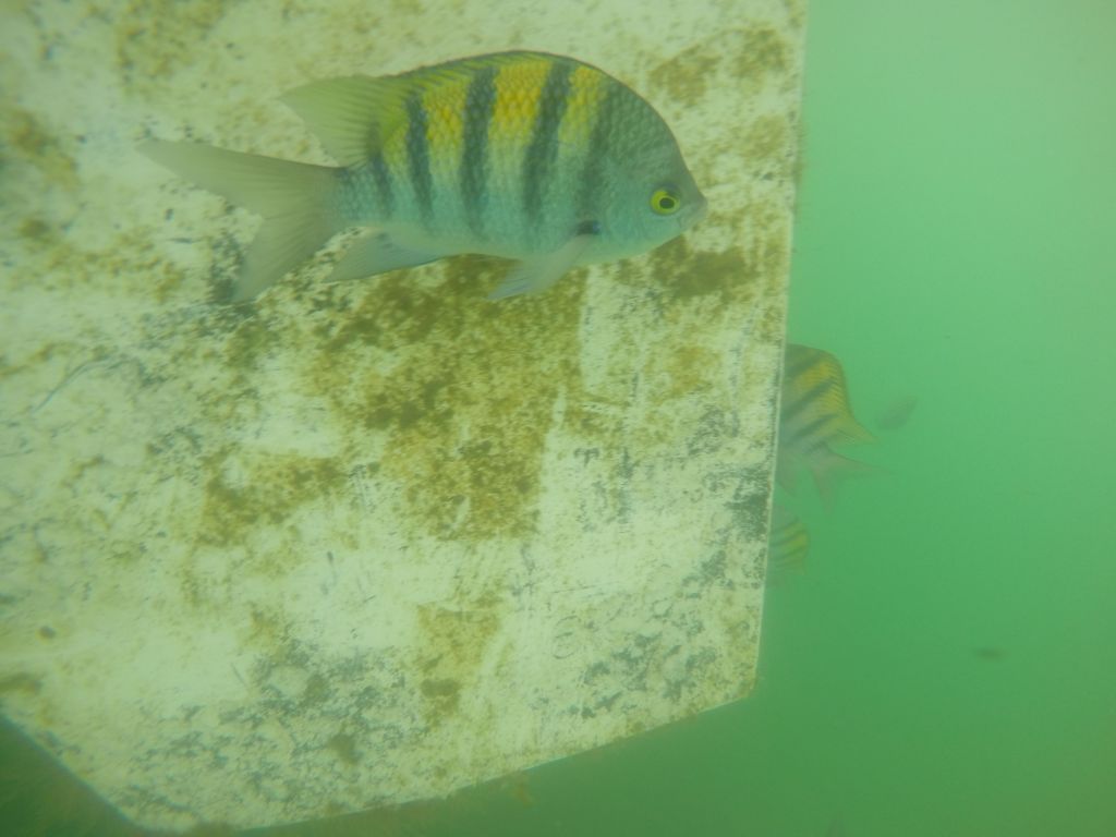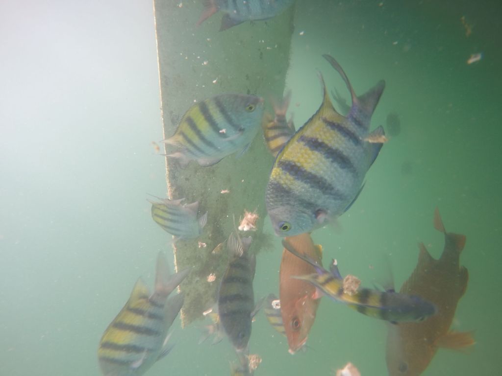 Am nächsten Tag gehe ich schon wieder runter. Ich habe mir die Hände an den Pocken aufgeratscht und komme eigentlich jeden Tag mit neuen Verletzungen aus dem Wasser. Heute sehe ich noch mehr Fische, die mich unter Wasser erwarten. Es sind wieder die schwarz-gelben Fische, die auch am Tag zuvor dabei waren. Dann sehe ich dieselbe Fischart in winzig und eine andere Art mit spitzen Zähnen. Dann sehe ich die Fische mit den spitzen Zähnen mit einem roten Bauch. Zwischenzeitig taucht auch ein Fisch auf, der so hoch ist wie meine ausgestreckte Hand, aber der ist schnell wieder weg.