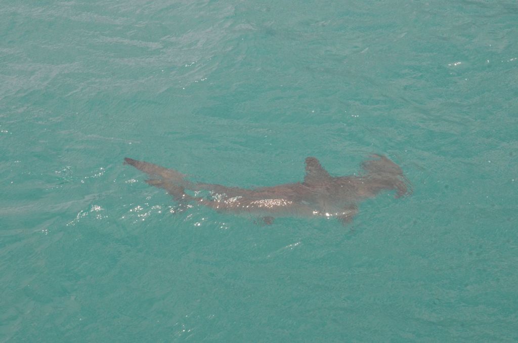 Einige Zeit später, am Horizont scheint es schon wieder unangenehm blau-grau, ruft La Skipper „Stopp!“. Sie hat eine Flosse erspäht. Natürlich schauen wir nach und sehen einen noch kleinen Hammerhai. Unbeirrt zieht er seine Wege an der Wasseroberfläche und lässt sich ausgiebig beobachten.