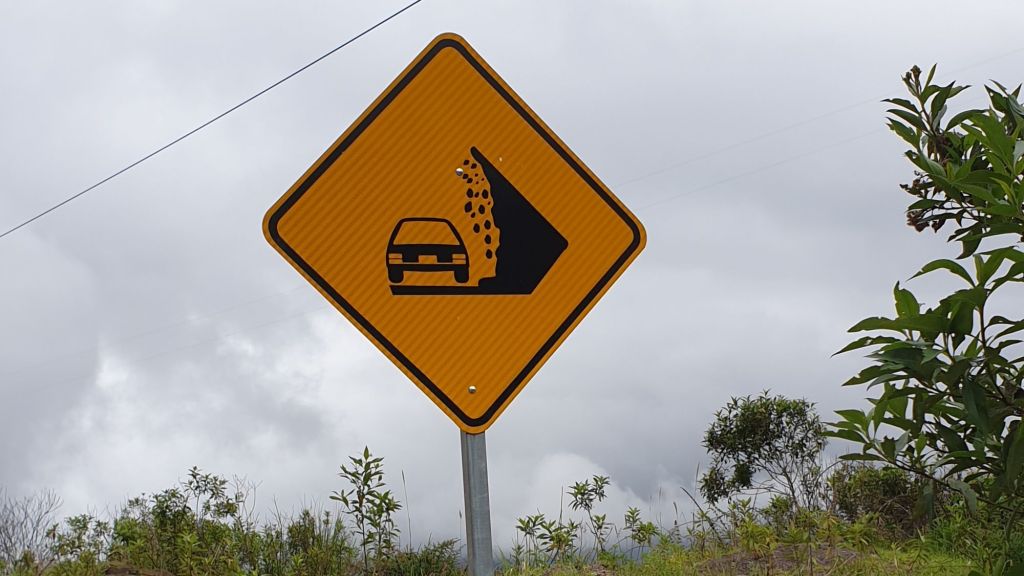 Ein gerade zur Regenzeit wichtiges Schild ist die Warnung vor Steinschlag. Dagegen ist im Fall eines Erdrutsches das Resultat nicht nur von gegebenenfalls ausdauernder Präsenz, sondern ohne jede beschilderte Vorwarnung nur eher provisorisch gekennzeichnet.