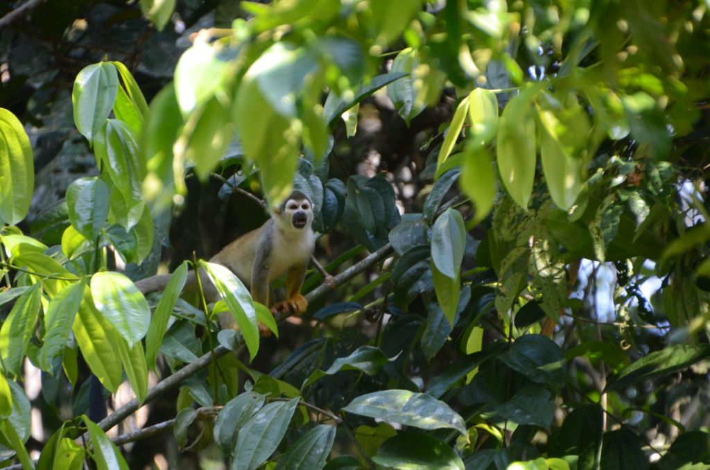 Ich und Samuel haben dann ein Specht mit rotem Kopf hoch oben auf einem Baum gesehen. Die anderen leider nicht. Wieder eine Affenart. Dieses Mal ist es ein Totenkopfaffen. Immer wieder fliegen Aras über den Fluss
