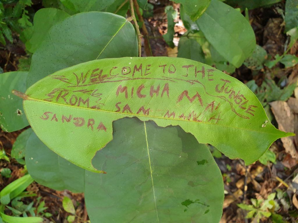 Dann hat unser Führer Rom ein Blatt von einem Baum abgerissen, einen kleinen Stock genommen und in das Blatt geritzt. Dabei hat er uns erklärt, dass die Blätter dieses Baumes etwas Besonderes können. Wenn jemand das Blatt anknabbert, sondert das Blatt einen Stoff aus, der nicht so lecker ist. Aber das schützt das Blatt. Und der Stoff ist rot. Wenn man also mit dem Stock da reinritzt, sondert das Blatt diesen Stoff ab. Und wenn man einen Buchstaben reinritzt, wird er rot. So kann man auf dem Blatt schreiben. Rom hat „Willkommen im Dschungel“ geschrieben. Dann haben wir alle unsere Namen auf das Blatt geschrieben.