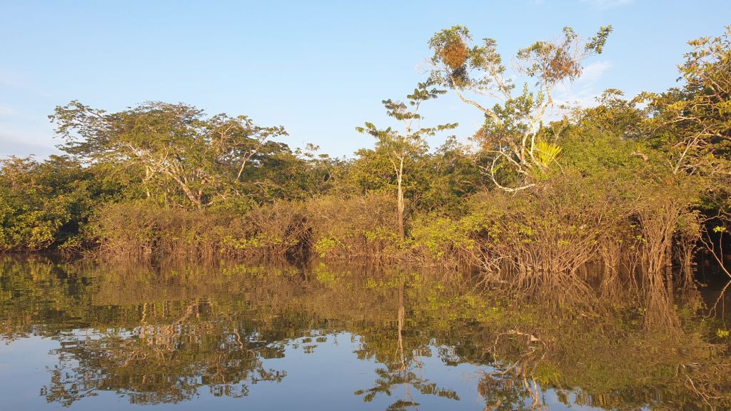 Dann sind wir in eine große Lagune gefahren. Sie heißt die „große Lagune“. Dort kann man baden und zwei andere Kanus waren schon da. Jemand sagt, dass sie gerade eine Anakonda gesehen haben. Dann haben wir uns auf den Weg gemacht, doch leider keine gefunden.
