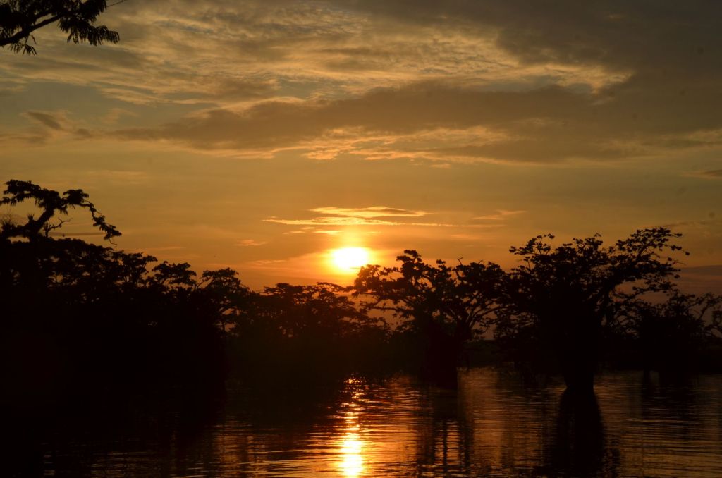 Kurz vor Sonnenuntergang sind wir noch kurz ins Wasser gesprungen. Das war nur 2 Meter tief und schön warm. Ich fand das mitten im Regenwald sehr mutig. Immerhin gibt es hier ja Anakondas und Kaimane und viele andere gruselige Tiere.