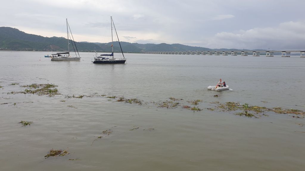 Der andere Haken ist der ausgesprochen starke Bewuchs. Das Boot liegt vor Anker oder an Moorings im stark strömenden und von landeinwärts gelegenen Fischfarmen gut gedüngten Fluss. In den zwei Monaten, die wir dort liegen, bildet sich trotz recht frischem Antifouling ein dichter Bewuchs. Ein spezielles Problem ist unsere Schraube. Angeblich gibt es den Service, diese von einem Mitarbeiter der Marina in einen Beutel einpacken zu lassen. Soll helfen.