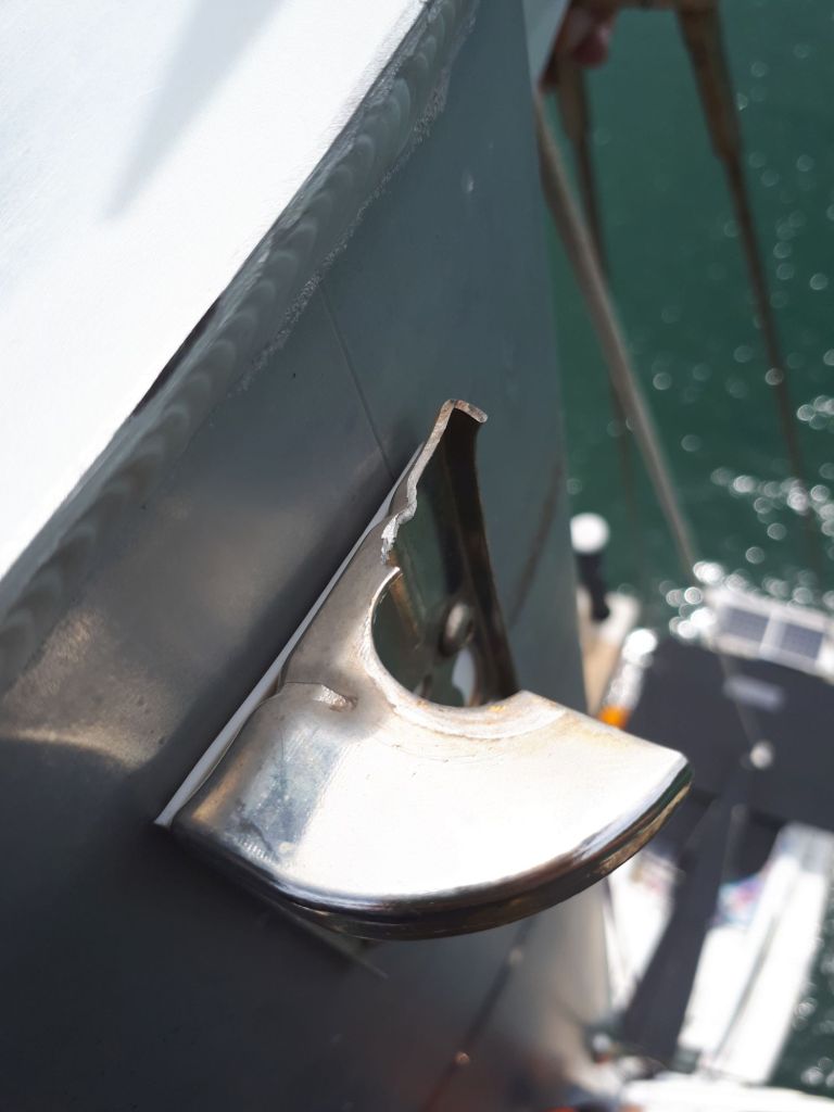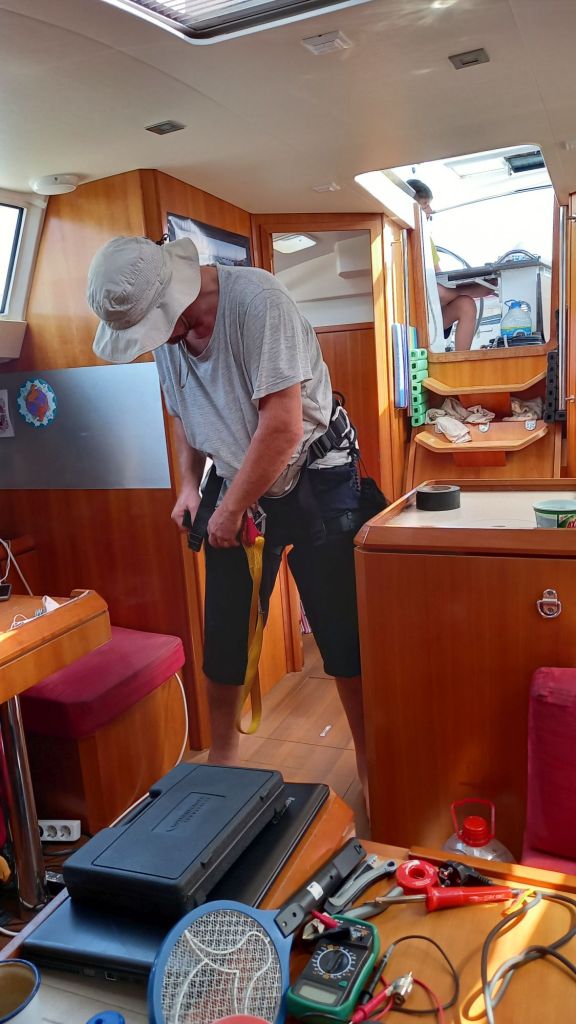 Wieder an Bord heißt es für den Skipper nun „auf in die Mastspitze“. Ich schraube die alte, gebrochene Halterung ab und die neue an. Glücklicherweise passen die zwei zusammen, so dass ich die alten Löcher und Schrauben wiederverwenden kann. Also zumindest die drei Schrauben, die mir nicht von da oben ins Wasser gefallen sind. Für die vierte Befestigung finde ich halbwegs passenden Ersatz in meinem Schraubenkästchen.
