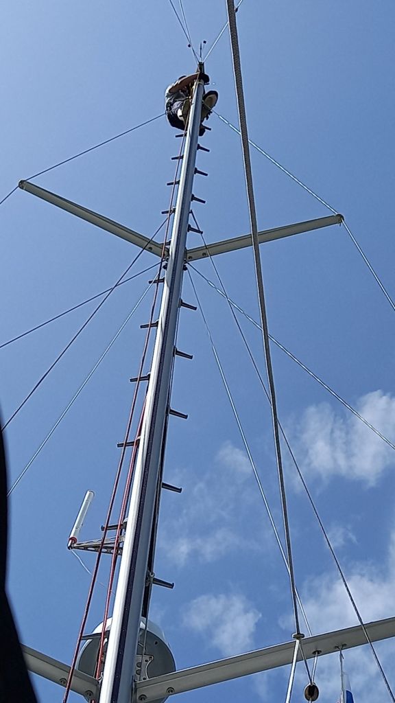 So, jetzt muss ich ja nur noch die Antenne anschließen. Da wird mir nicht erstmals, nun aber so richtig bewusst, dass da oben ja nur noch ein abgerissenes Coax-Kabel aus der Mastspitze hängt. Irgendwann dieser Tage melde ich mich dann auch mal per WhatsApp bei unserem „guten Geist“ Nils von Blue Sailing. Er kennt die Installationen unserer Samai so gut wie kaum ein, wenn nicht kein anderer. Auch an dieser Stelle noch einmal vielen Dank für Deine Zeit und Deinen Input!