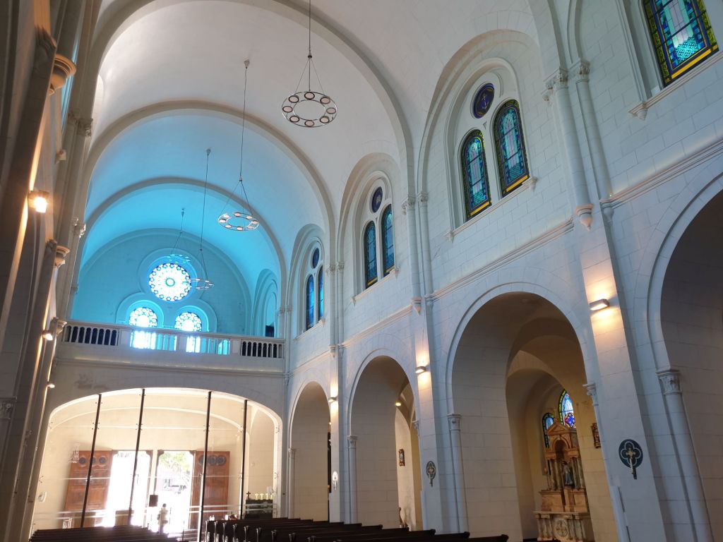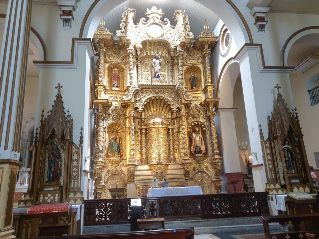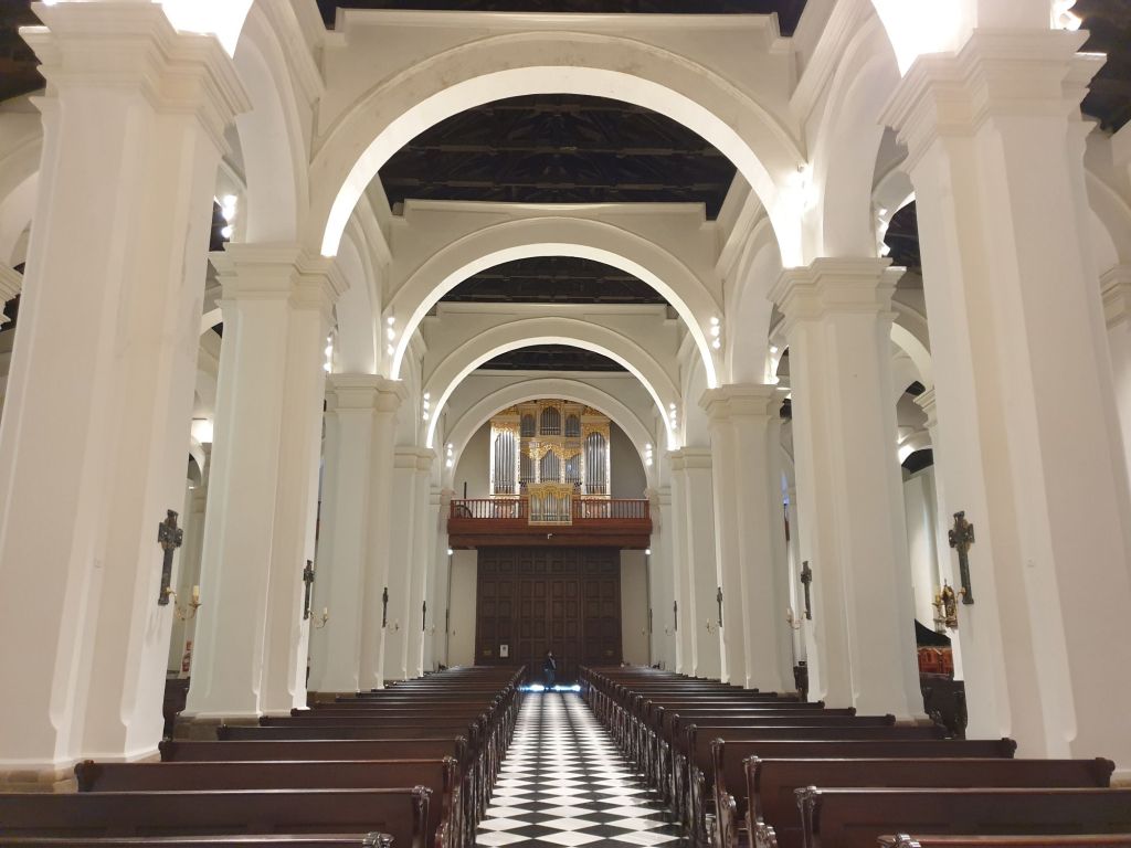 Gegenüber lockt mit der wohl klimatisierte Kathedrale der Stadt das wichtigste katholische Gotteshaus de Stadt. Ein Déjà-vu. Wieder stehen sehr nüchterne, weiß verputze Säulen und die hierzulande anscheinend typisch schlichte Holzdecke einem prunkvollem Altar gegenüber. Davor die Flaggen Panamas und des Vatikan.
