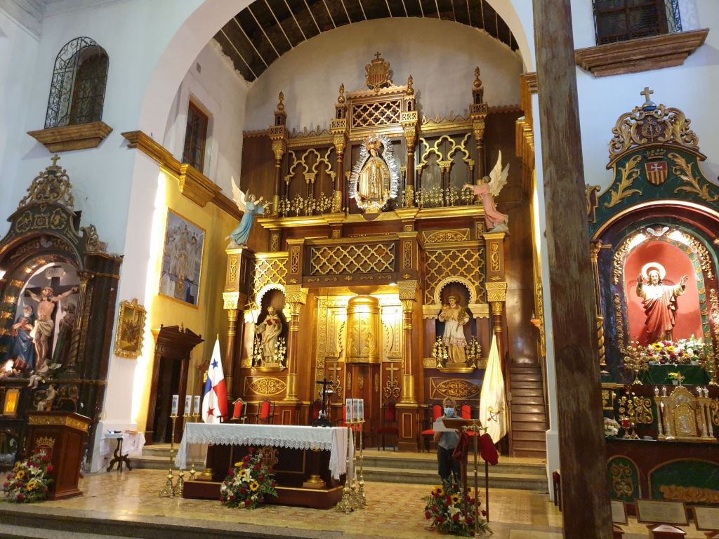 Ok, auf dem Weg zur Fußgängerzone nebst großen Supermarkt schauen wir dann doch noch in die Iglesia Nuestra Señora de la Merced. Diese endgültig letzte Kirche auf unserem Spaziergang hat als einzige im alten Quartier noch Holzdecke und -säulen im Original aus der Kolonialzeit. Ansonsten fällt ein kleiner Seitenaltar auf, an dem die Panamaer offensichtlich Segen für das eigene Heim erbitten.