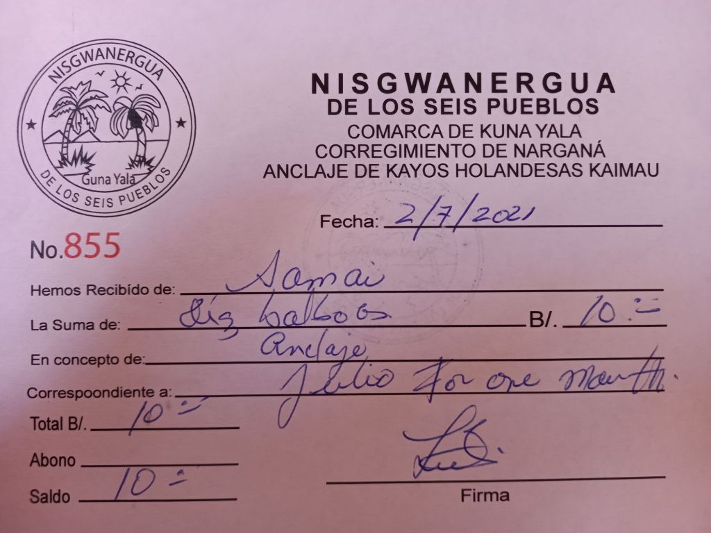 Bei unserer Ankunft sind wir das vierte Boot im Swimming Pool. Nach kurzer Rumpf-Streicheleinheit einer sandig-flachen Untiefe finden wir einen schönen Platz. Der Anker sitzt noch nicht fest, da nimmt schon ein Kuna-Kanu Kurs auf uns. Kurz danach liegt es längsseits und verlangt Ankergebühr. Wir sollen 10$ bezahlen. Dafür dürfen wir dann auch einen ganzen Monat bei den Holandes Cays ankern. Das ist der zu bezahlende Mindestzeitraum. Immerhin bekommen wir eine schöne Quittung. Super.