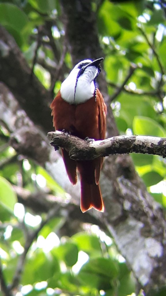 Schließlich ist es Samuel, der das heutige Bild auf seinem Handy raussucht. Schon in Ecuador, spätestens aber in Costa Rica hat er sein Faible für Vogelbeobachtungen entdeckt. Seit Panama haben wir auch ein gutes Fernrohr an Bord. Durch so eines ist bei einer Beobachtungstour in Monteverde (Costa Rica) unser Bild eines Dreilappenkotinga entstanden. Dieser Vogel findet sich nur in Mittelamerika von Honduras bis Panama. Das namensgebende Männchen ist unverkennbar. Über dem dunkel geröteten Körper leuchten Brust und Kopf in weiß. Und vom Schnabel hängen drei nackte Kehllappen. Ein Vogel, der in Erinnerung bleibt!