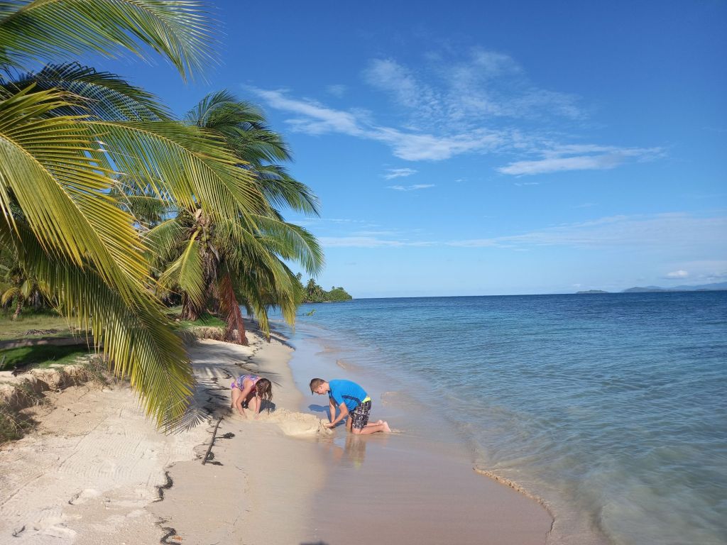 Badesachen angezogen, rein ins Dinghy und los geht es. Was soll ich schreiben?! Es ist echt wunderschön hier. Feiner, gelber Sand, wir planschen im warmen Wasser, über uns scheint die Sonne von blauem, nur mit einigen weißen Tupfern versehenem Himmel und im Hintergrund schaukelt unsere Samai in der einsamen Bucht… Postkarten-Idylle pur!