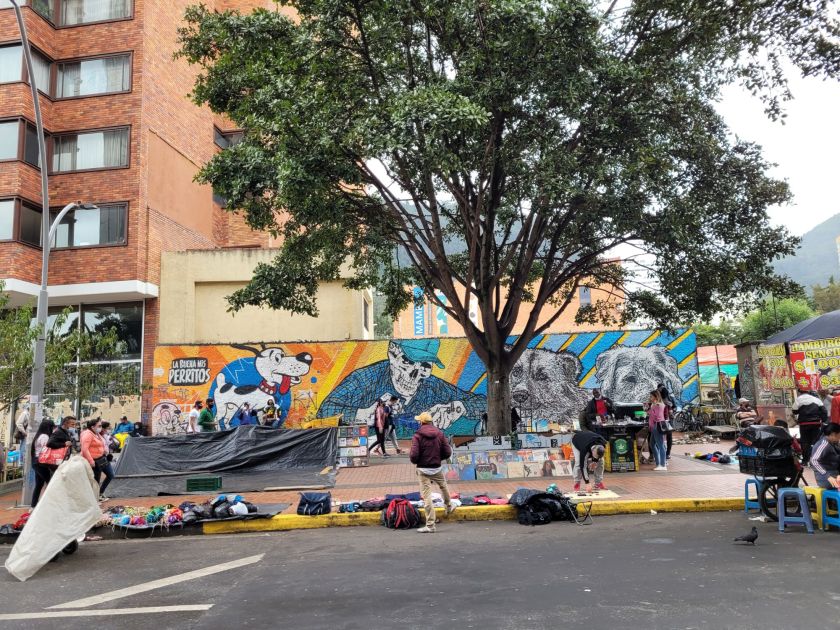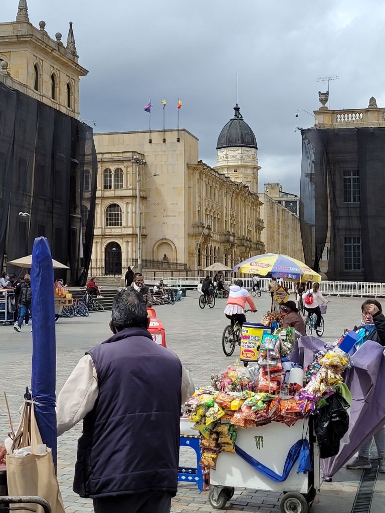 Der erste Stopp ist am zentralen Plaza de Bolívar. Um die unvermeidliche Statue des Namensgebers versammeln sich historische Gebäude wie die Catedral Primada de Colombia (Ost), das Nationalkapitol (Süd), das Rathaus (West) und der Palacio de Justicia de Colombia (Nord). Der auf die präkolumbianische Zeit zurückgehende Platz, wurde schon ab 1539 bebaut und war stets ein öffentliches Zentrum, sei es für Märkte, Zirkus oder auch Stierkämpfe. Uns fällt sofort ins Auge, dass viele Fassaden schwarz abgehängt sind… und darunter schimmert der ein oder andere Farbklecks hervor. Tatsächlich wurden im Zuge der auch in Europa nachrichtlich thematisierten Ausschreitungen der letzten Monate immer wieder Farbbeutel geworfen. Die Netze sollen diesen Vandalismus zumindest eindämmen.