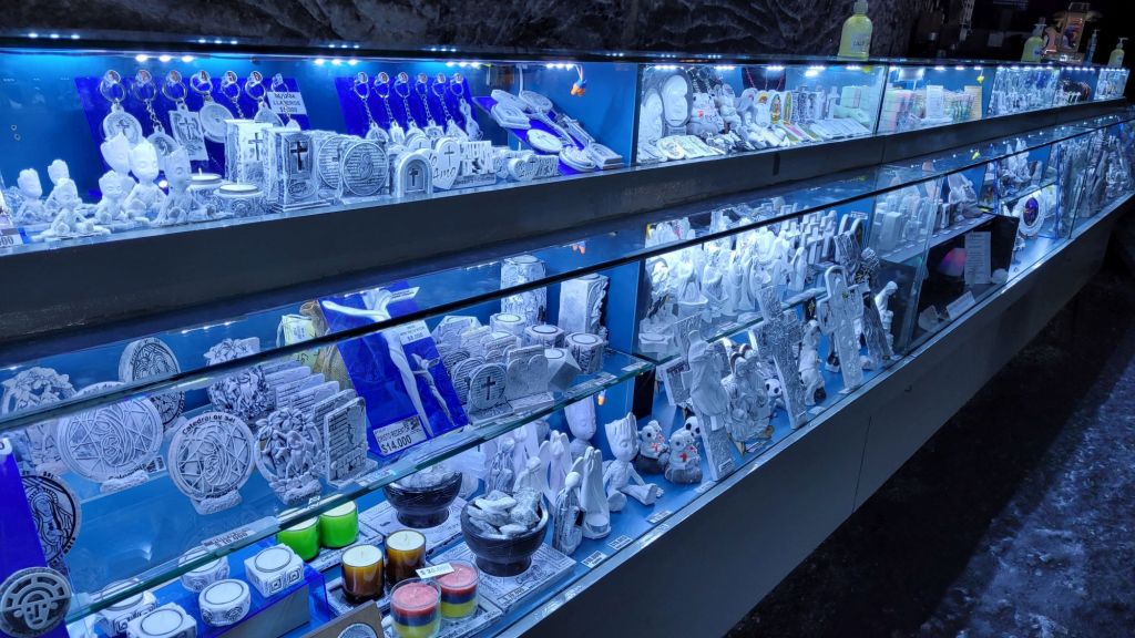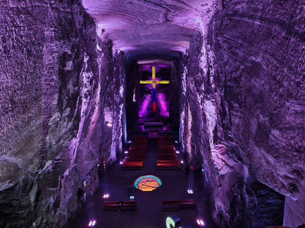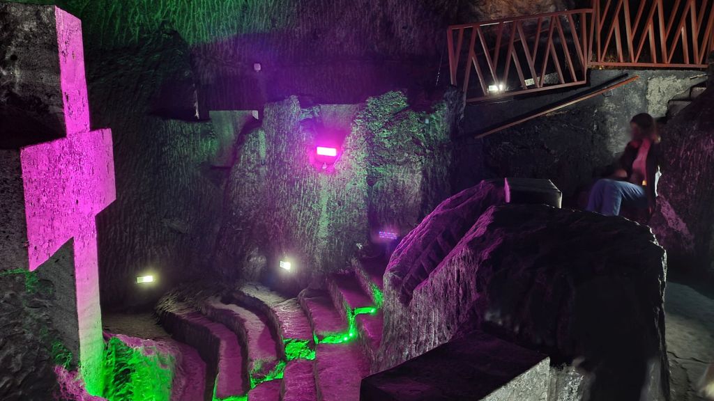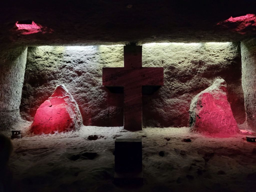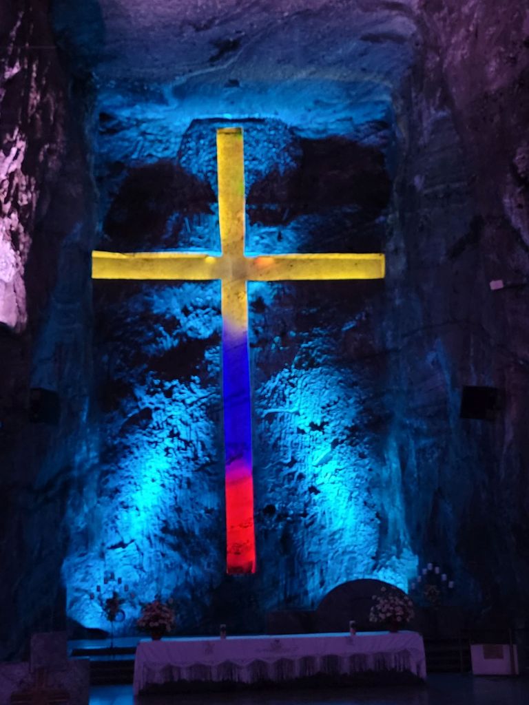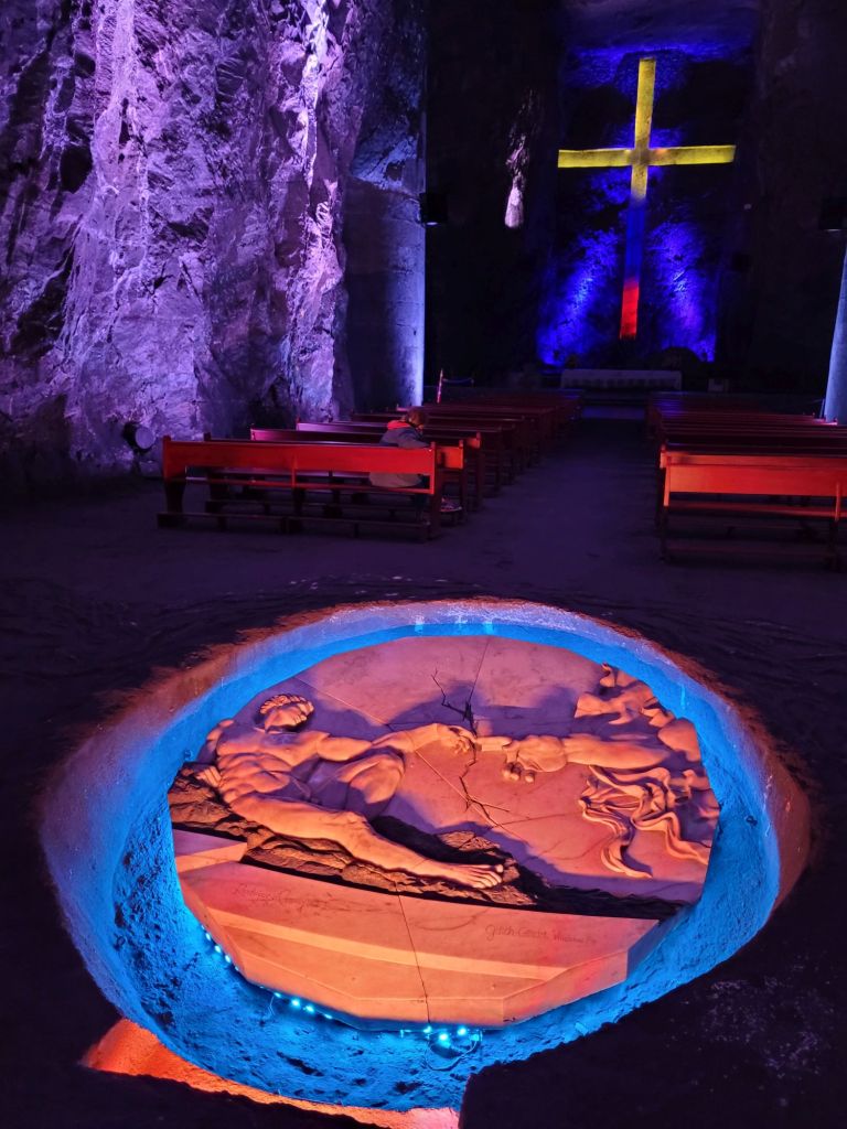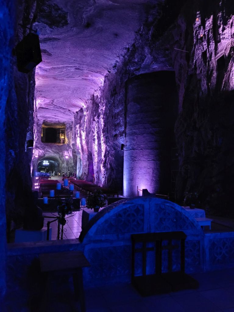 Dabei ist der Name Catedral de Sal im Grund etwas hochtrabend, da es sich nicht um eine offizielle, einem Bischof unterstehende Kathedrale handelt. Wohl aber ist es ein richtige katholische Kirche. Genau genommen sogar schon die zweite ihrer Art. Erste Ideen gibt es 1932. Die alte „Kathedrale“ wird 1954 eingeweiht, jedoch 1990 aus Sicherheitsgründen für die Öffentlichkeit geschlossen. Direkt im Anschluss beginnen 60m tiefer die Arbeiten an einer neuen Kathedrale, die im Dezember 1995 eingeweiht wird.