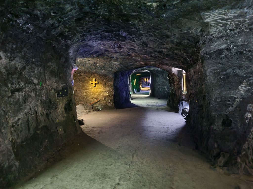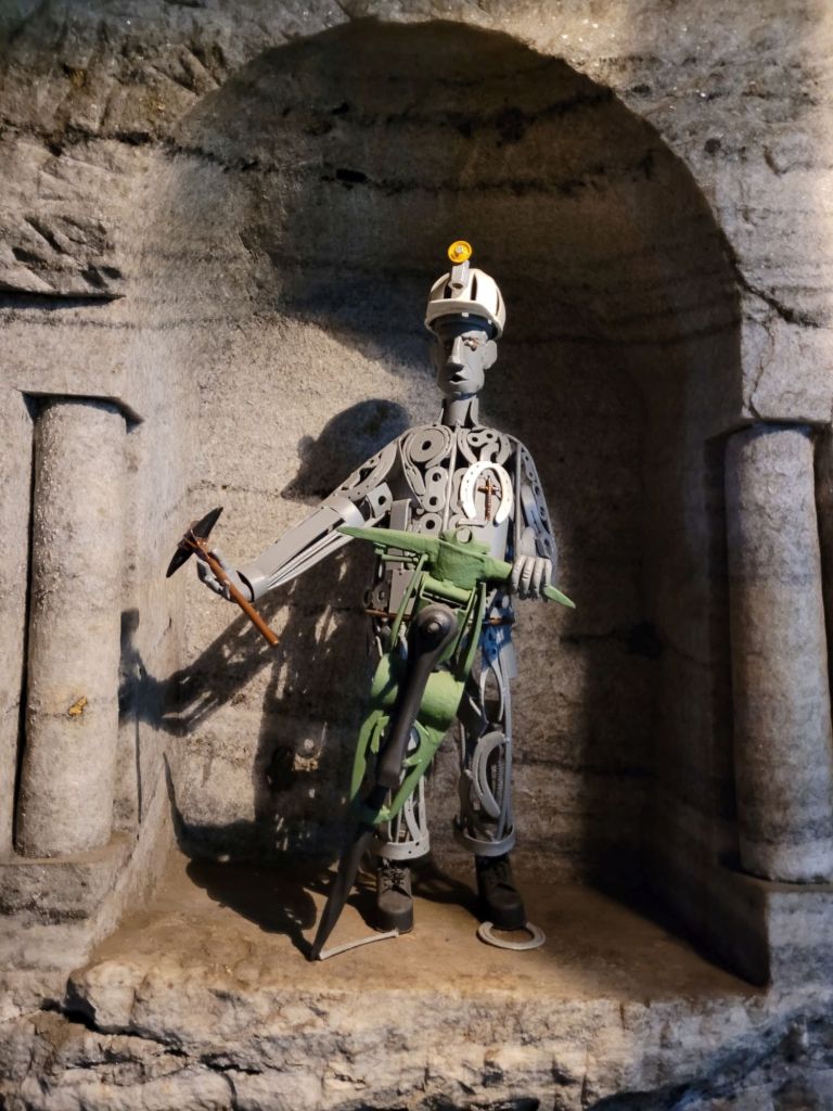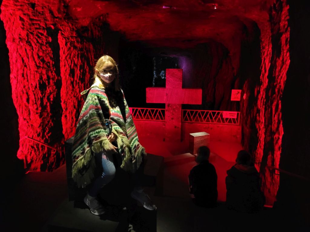 Ein langer, gerader Gang führt unter die Erde in die Minenstollen und zum Beginn des Kreuzwegs. Die vierzehn Stationen sind auf den ersten Blick immer gleich, auf den zweiten Blick aber dann doch sehr individuell und passend umgesetzt. Im Hintergrund ertönt kirchliche Musik. Eine schöne Stimmung.