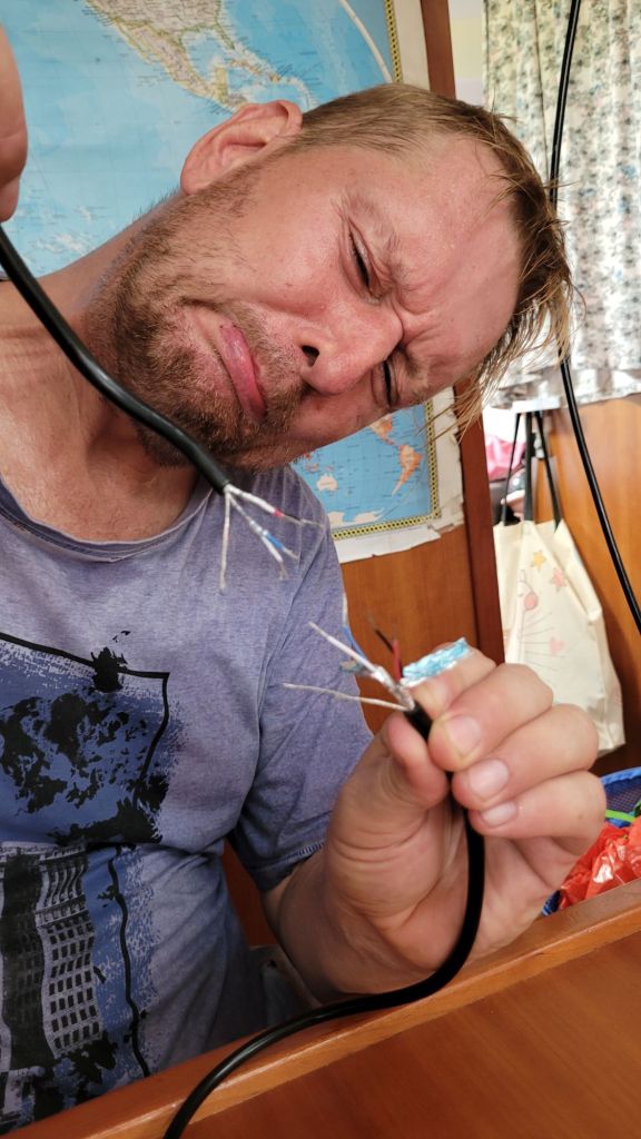 Am nächsten Tag der nächste Versuch. Kabel wieder raus und nun nur an einer neuen Sorgeleine so verbunden, dass der Zug immer an der Steckerspitze ansetzt. Nützt nur nichts. Etwa 2m vor dem Ziel geht es nicht weiter. Jetzt habe ich endlich genug. Inzwischen hänge ich für diese Aktion insgesamt schon über zwei Stunden in der unruhigen Mastspitze. Auch Samuel und La Skipper am Mastfuß haben – vorsichtig ausgedrückt – genug. Kurzerhand schneide ich den Stecker ab und verbinde das blanke Kabel mit der Sorgeleine. Wieder gibt es ordentlich Vaseline und es dauert keine 5 Minuten, bis das Kabel unten rauskommt. Endlich. Nun muss ich nur noch die fünf dünnen Adern wieder so verbinden, dass die Windinformationen aus der Mastspitze auch störungsfrei im NMEA-Bus ankommen…