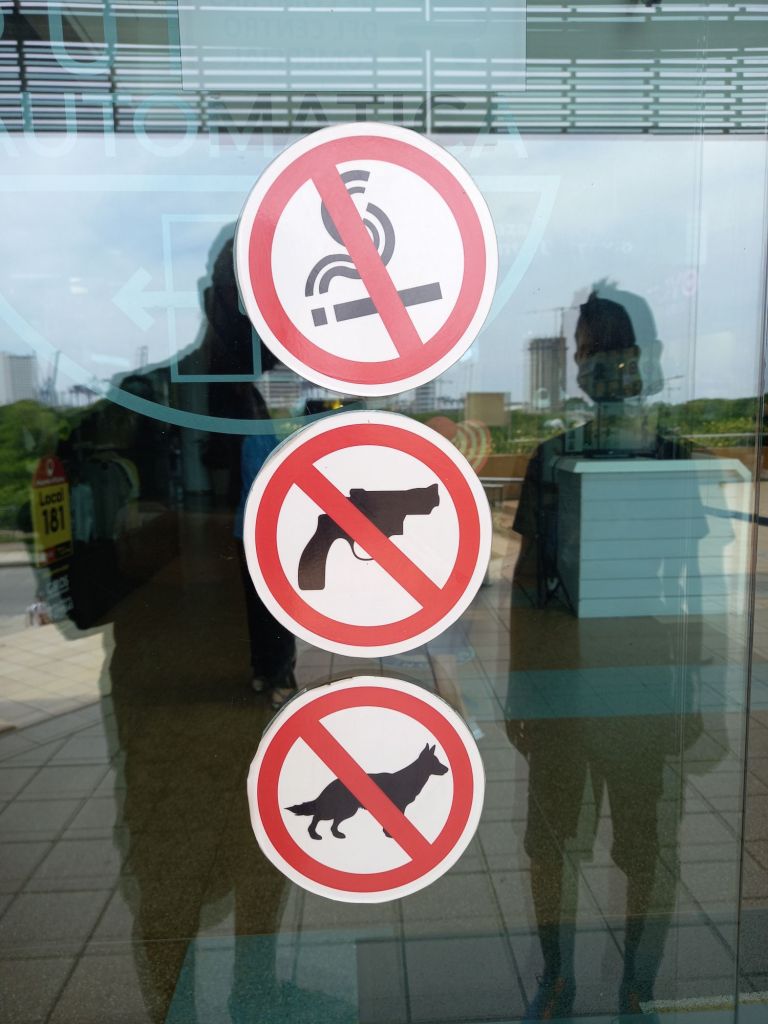 Hier in Kolumbien werden die Prioritäten offensichtlich etwas anders, dafür aber ausgesprochen deutlich gesetzt. Nicht nur der große Hund hat Ausstrahlung, auch ein explizites Verbot von Schusswaffen im Einkaufszentrum haben wir vorher so noch nicht gesehen…