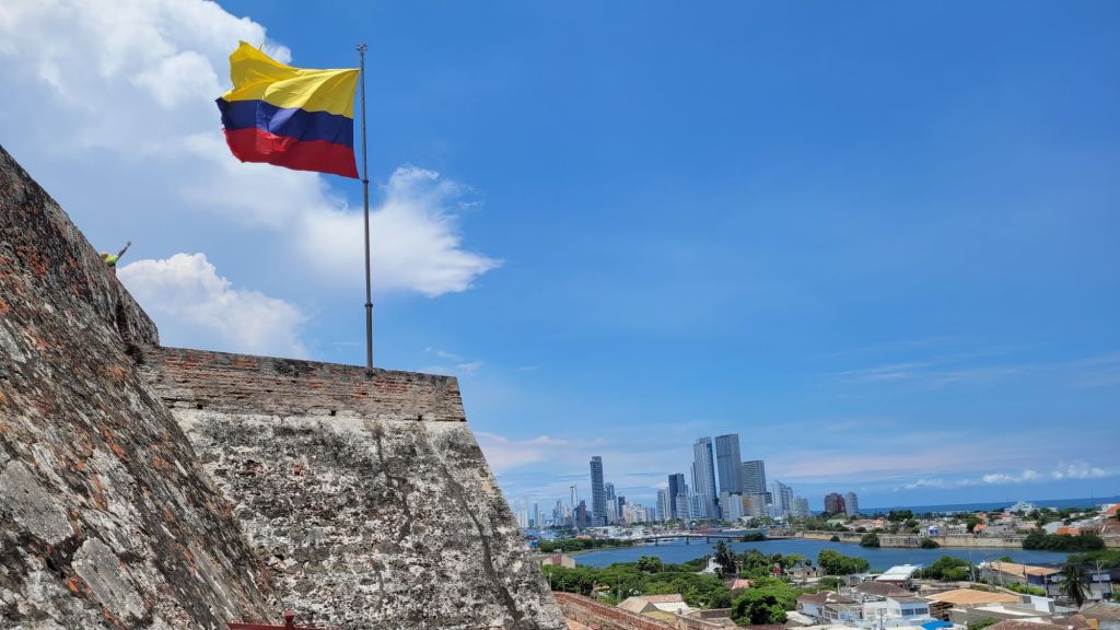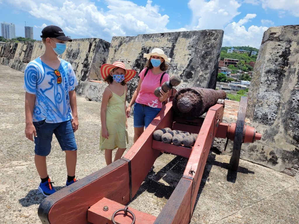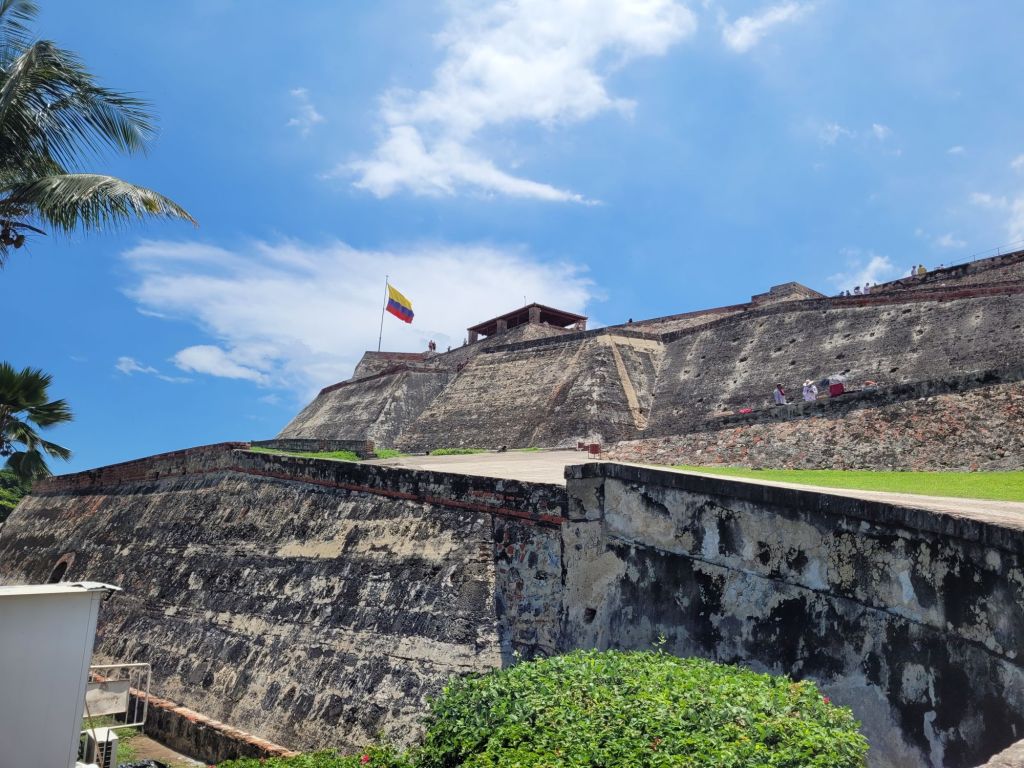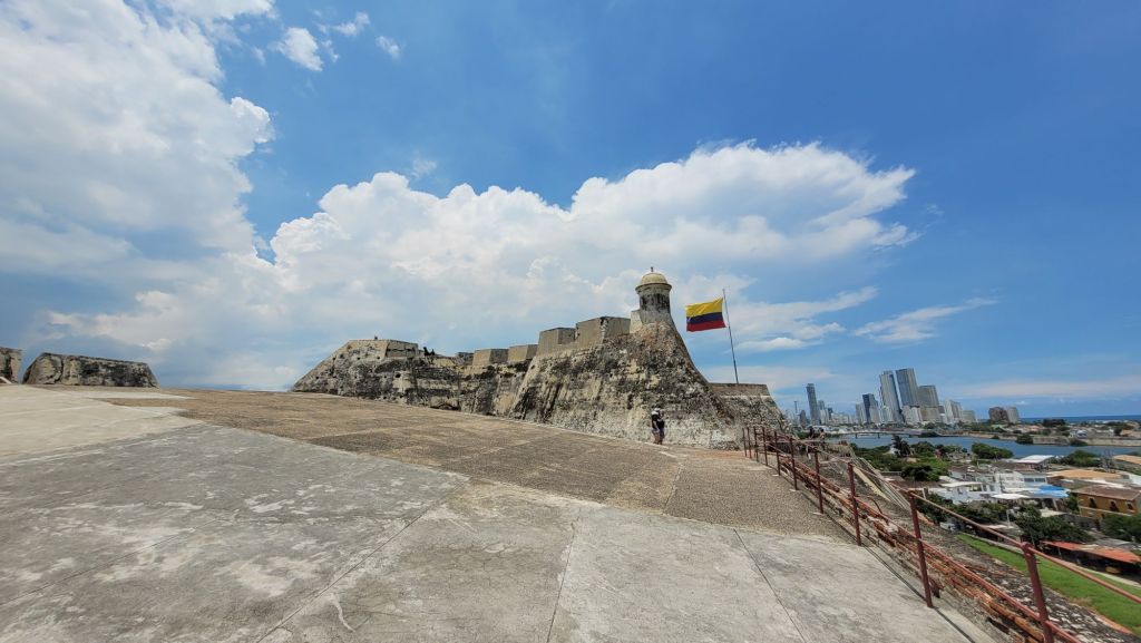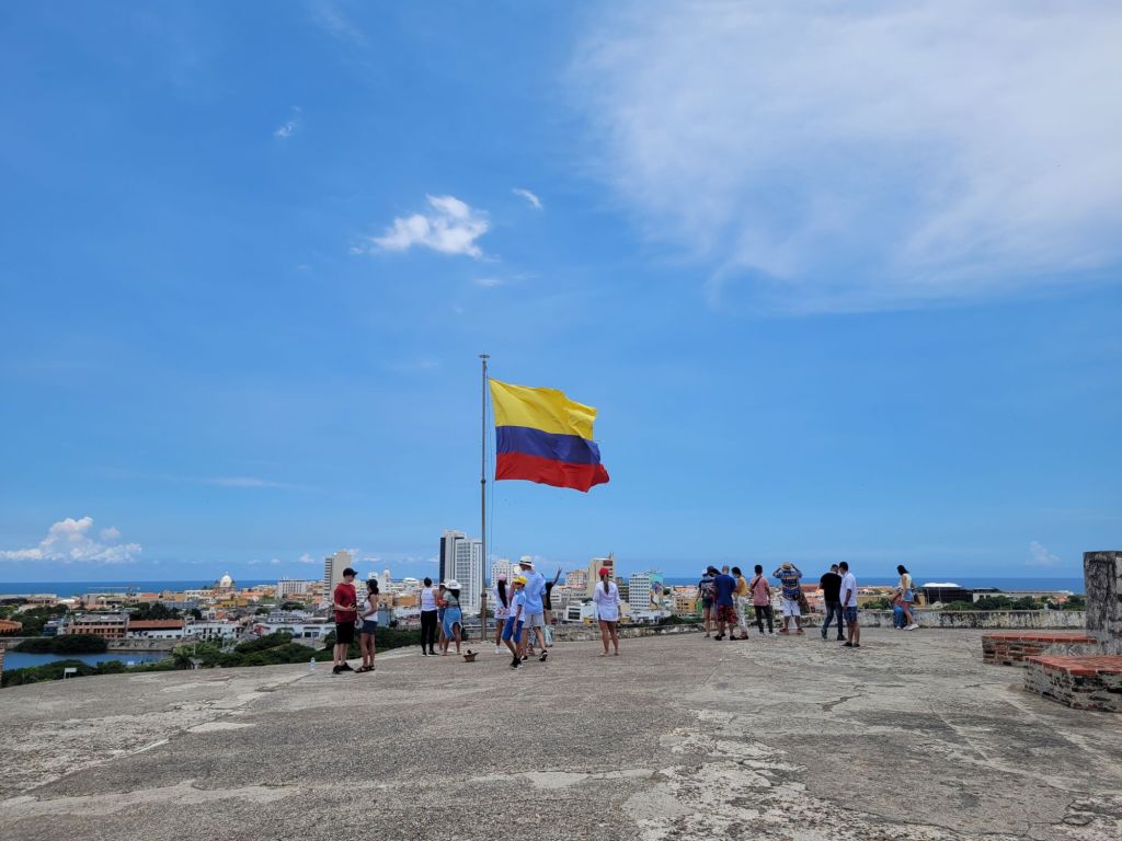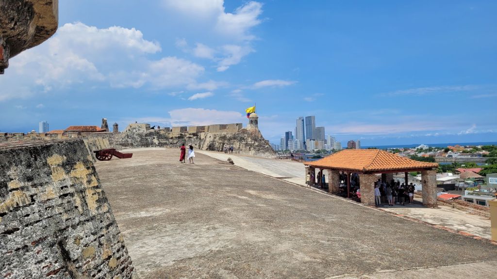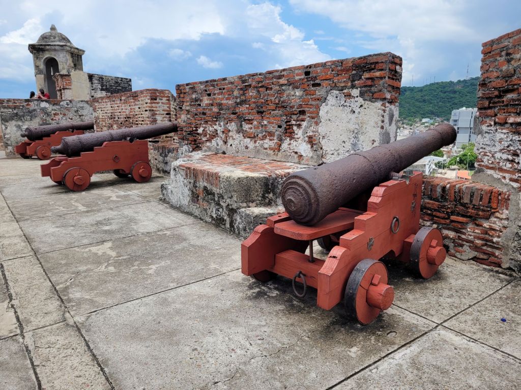 Die Sonne brennt erbarmungslos vom blauen Himmel. Der Aufstieg ist schweißtreibend aber lohnenswert. Bunte Auslagen der Souvenierverkäufer säumen den Weg. Wir schlendern über die verschiedenen Verteidigungsbatterien, unvermeidlich stehen alte Kanonen herum und im Wind flattert eine große kolumbiansche Flagge als beliebtes Fotomotiv.