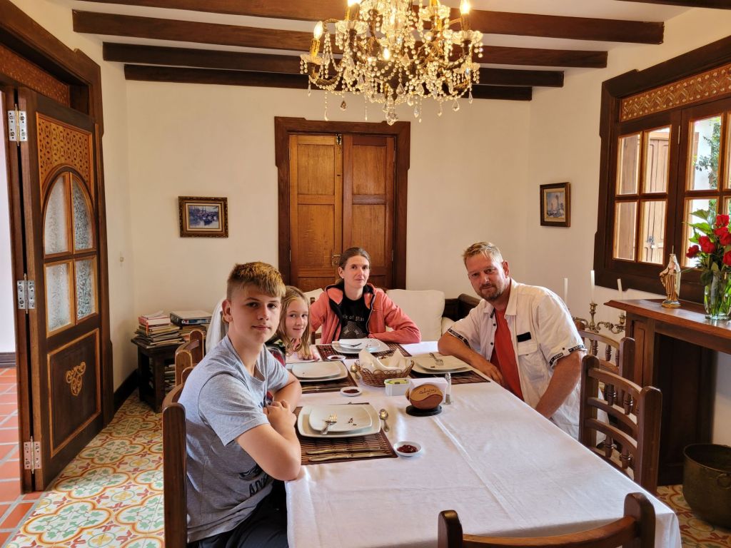 Der nächste Morgen sieht den Skipper wieder lächeln. Ok, ein bisschen gequält, aber immerhin bin ich wieder so leidlich einsetzbar. Bei unserem wieder einmal leckeren und entspannten Frühstück schaut auch Germán noch einmal zu einem Abschiedsbesuch vorbei.