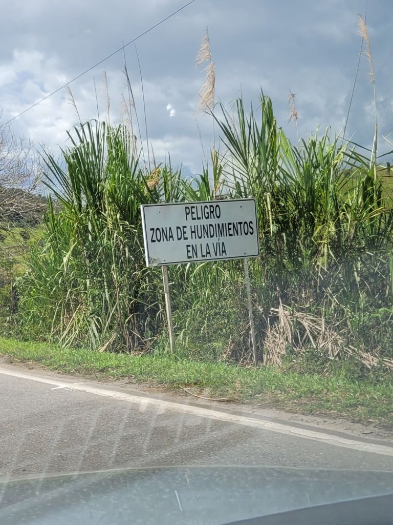 Auf den schmalen, meist unbefestigten Nebenstraßen findet man Warnungen und Hinweisschilder vergeblich. Autofahren auf eigene Verantwortung. Hier kann man ja schon froh sein, wenn ein abgebrochenes Stück Straße irgendwie markiert wurde. Auch halten sich die Folgen von Erdrutschen deutlich länger. Unbestrittener Höhepunkt ist eine (immerhin markierte!) Stelle auf dem Weg von Salamina nach Honda…