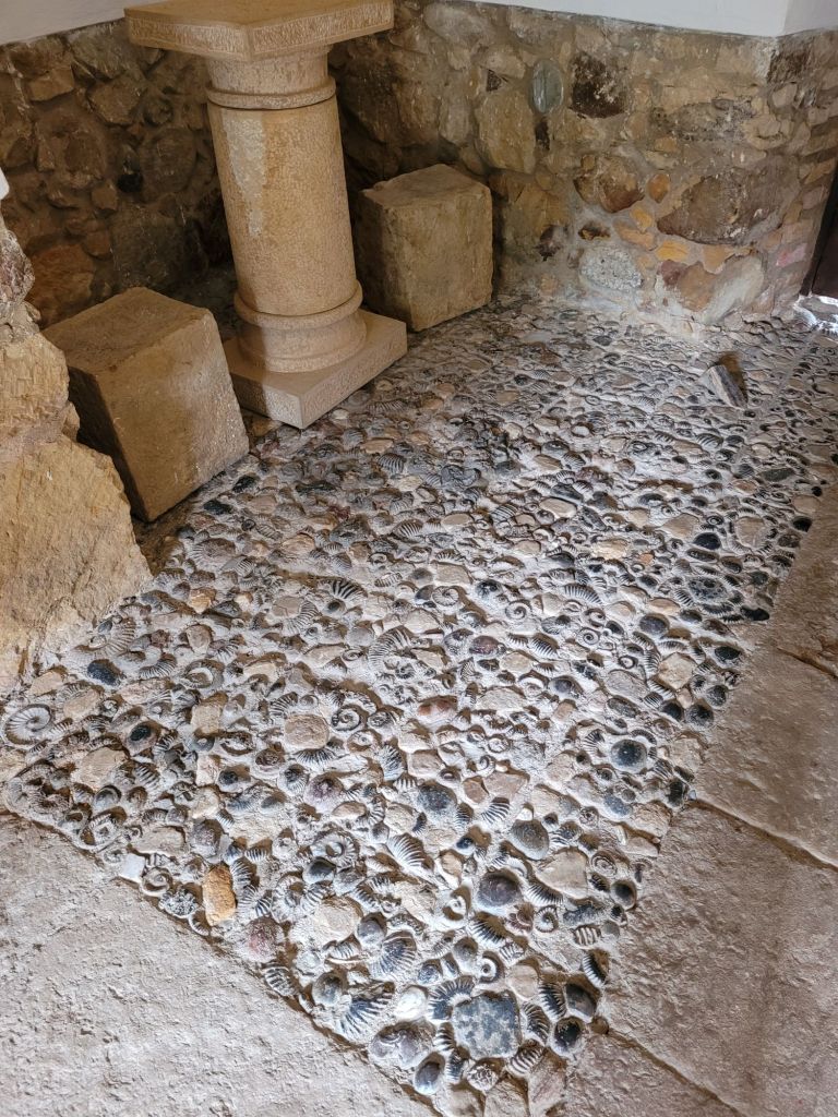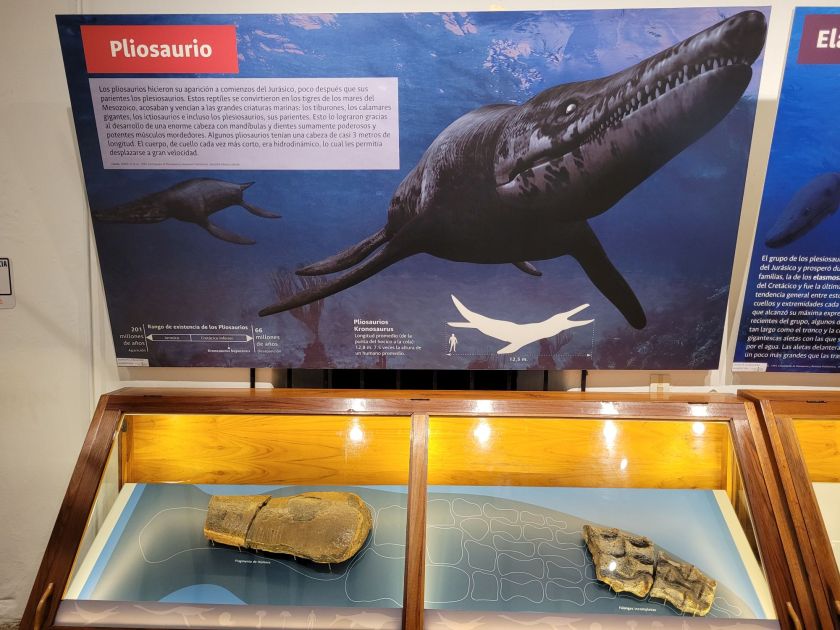 Es ist zwar nur ein kleiner Raum und leider ausschließlich auf Spanisch beschriftet, trotzdem sehr liebevoll arrangiert. Wir sind als Berliner durch das wirklich tolle Naturkundemuseum verwöhnt, finden aber auch hier Erstaunliches. Sehr viele Arten unterschiedlichster Ammoniten, viele weitere Versteinerungen von Pflanzen, Muscheln und anderen Kleintieren sowie Gesteine (Gneis, Basalt, Quarz, Granit, Diorit). Das wäre was für die Sammlung unseres Gesteine und Mineralien liebenden Samuel. Leider gibt es nichts zum mitnehmen. Das Highlight ist natürlich die hintere Partie eines versteinerten Plesiosaurus und der Kopf eines Ichtiosaurier.