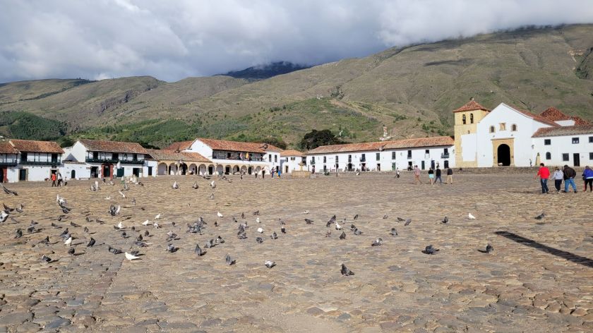Die meisten Dörfer in Kolumbien haben einen Hauptplatz in bester Lage. Der Plaza Mayor in Villa de Leyva ist mit seinen 120x120m wohl einer der größten Stadtplätze von Amerika. Gesäumt von hübschen einstöckigen Kolonialbauten und einer einfachen Pfarrkirche befindet sich auf dem Platz nur ein kleiner Muedejar Brunnen, der seit 4 Jahrhunderten die Bewohner mit Wasser versorgt. Das jahrhundertealte Kopfsteinpflaster trägt sehr zum Charme bei. Hier wurden sogar schon Filme gedreht. Eigentlich hätte der Platz, wie fast überall in Kolumbien, nach Simón Bolívar benannt sein können, aber hier heißt er angenehmerweise mal einfach nur Plaza Mayor – der Hauptplatz.
