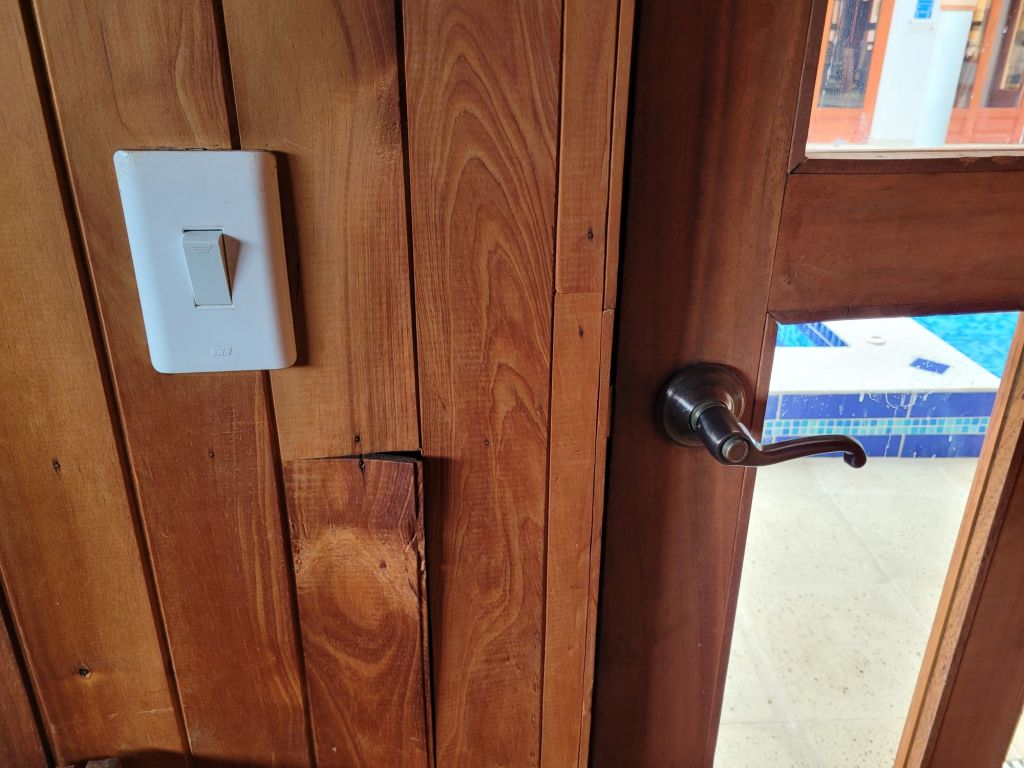 Dann gibt es da auch noch einige ich sage mal „technische“ Selbstverständlichkeiten bei der Einrichtung einer Sauna… zumindest in den Ländern, in denen ich bisher so im Schwitzkasten war. In Kolumbien sieht man manche Dinge dagegen eher pragmatisch. Ein Lichtschalter vor der Tür ist schließlich auch sehr unpraktisch, wenn man es sich gemütlich machen möchte, ohne die Tür zu öffnen. Genau darum wurde der haushaltsübliche Lichtschalter hier im Innern der Sauna montiert.