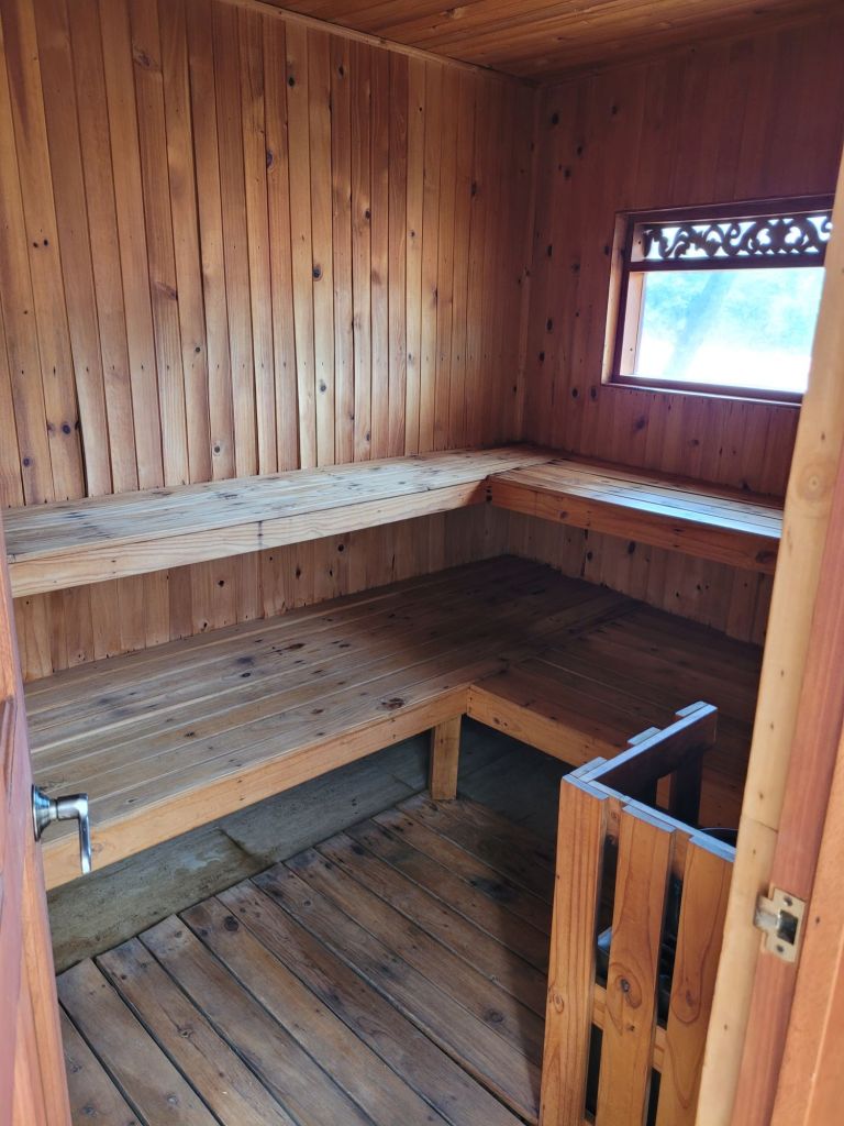 Manchmal kommt jemand in die Sauna und macht einen Aufguss. Da wird dann aromatisiertes Wasser auf den heißen Ofen getan und mit einem Handtuch eifrig gewedelt. Für viele ist das ein Höhepunkt. Und diesen möchte man seinen Gästen offensichtlich auch hier bieten. Wie sonst erklärt sich dieser halb gefüllte, gemütlich vor sich hinblubbernde Metalleimer auf dem Ofen? Ich sage mal so… über trockene Luft kann man sich nicht beschweren.