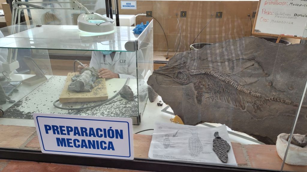 Der Name ist etwas schwergängig, bezeugt aber, dass es sich nicht nur um ein ausstellendes Museum handelt. Es ist zugleich eine Forschungseinrichtung. Nur durch einige Glasscheiben getrennt, beobachten wir Menschen in weißen Kitteln beim Säubern und Untersuchen von Fossilien. Es erinnert ein bisschen an einen Zoo, aber die Forscher scheint es nicht zu stören.