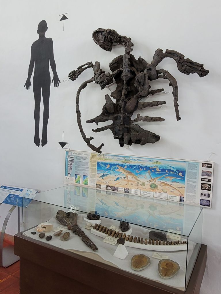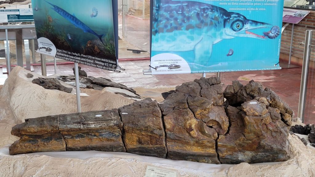 Ein anderer in Kolumbien, gerade in kleineren Einrichtungen, eher selten zu anzutreffender Umstand ist die durchgängig zweisprachige Beschriftung. So können wir ganz ohne Google Translate verstehen, was uns zu den tollen Exponaten erklärt wird. Im Zentrum präsentieren zwei Bereiche urzeitlich-maritime Höhepunkte. Einerseits werden Fossilien von urzeitlichen Meeresschildkröten und Fischen, viele Ammoniten jeder Größe sowie Schädel von Ichthyosaurier gezeigt.