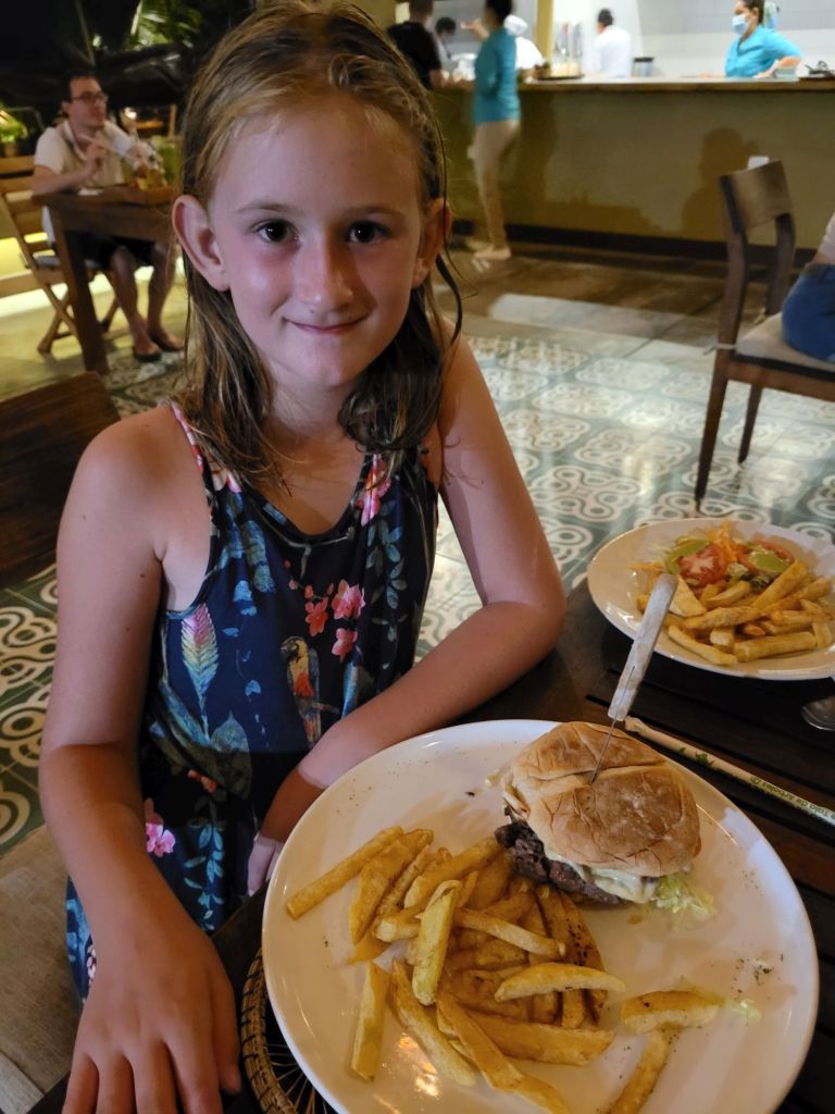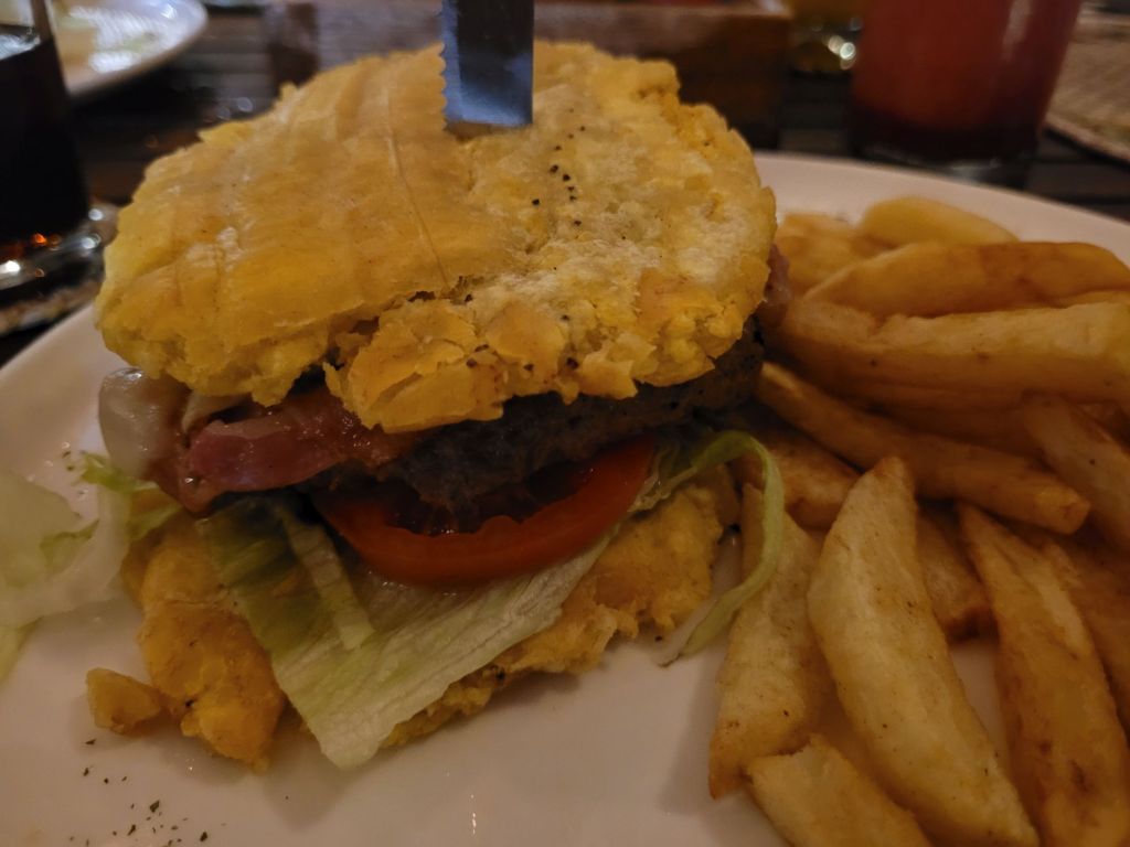 Soweit so normal. Doch dann lese ich in einer Speisekarte unter „Hamburguesa Angus“ folgenden Hinweis: Recomendamos cambiar el pan par patacones. Wie jetzt… es wird empfohlen, das Brot gegen Patacones zu wechseln?! Hmm… das klingt interessant. Selbstredend findet sich von der Samai nur ein Freiwilliger für dieses Experiment. So bekommt der Skipper also eine Kombination serviert, das wir so auch noch nicht gesehen haben.