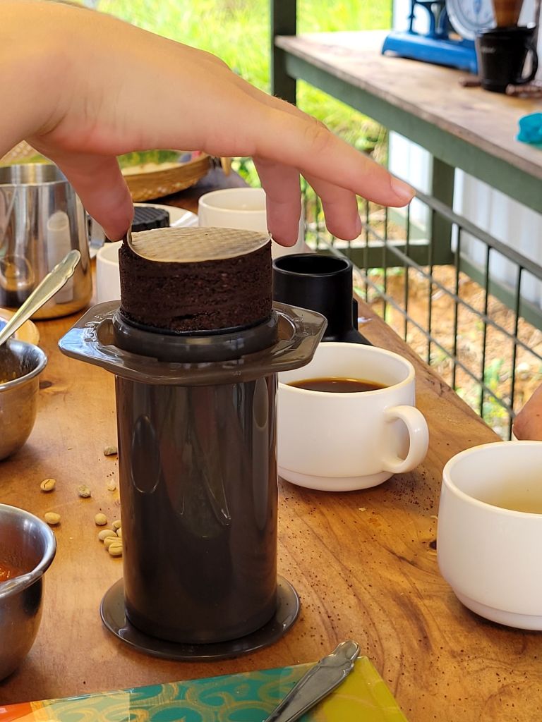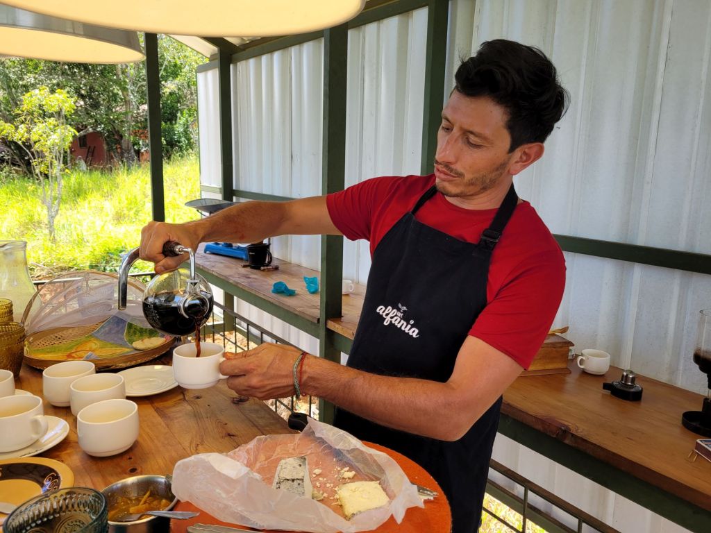 Den Abschluss der Tour bildet eine Kaffee-Verköstigung. Doch es gibt nicht nur das braune Gold zu trinken. Auf dem Tisch stehen schon frische, die besten bisher gegessenen Arepa (Maisfladen), hausgemachte Marmelade und Ziegenkäse bereit. Mit letzterem ist Carlos jedoch nicht glücklich. Spontan lässt er Ersatz heranbringen und dieser von einem guten Freund und Nachbarn hergestellte Ziegenkäse sucht (zumindest in der Geschmackswelt des Skippers ;-) wirklich seines Gleichen. Was für ein Genuss! Dazu noch frische Säfte und natürlich Kaffee. Carlos bereitet die Kostproben auf bisher nicht gesehene Art zu und serviert sie mit sichtlichem Stolz. Und ja, dieser Stolz ist wirklich gerechtfertigt.