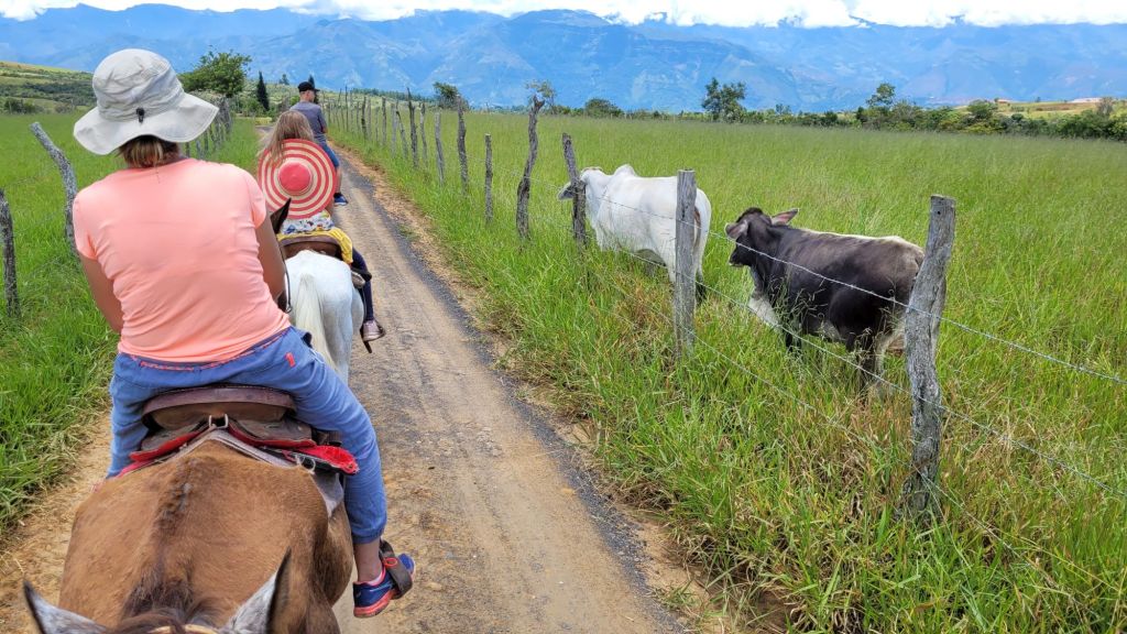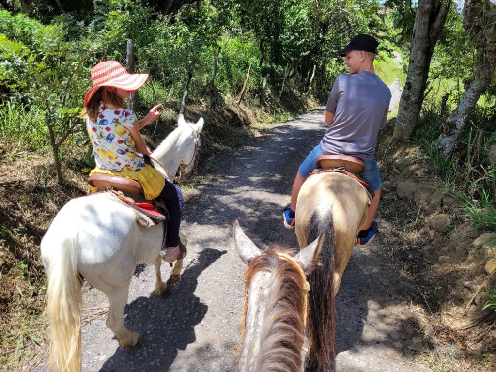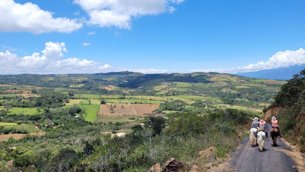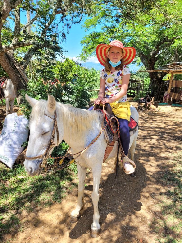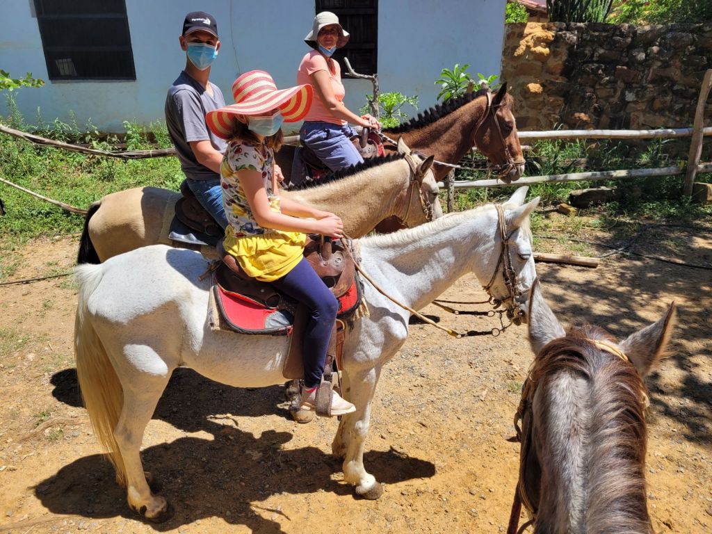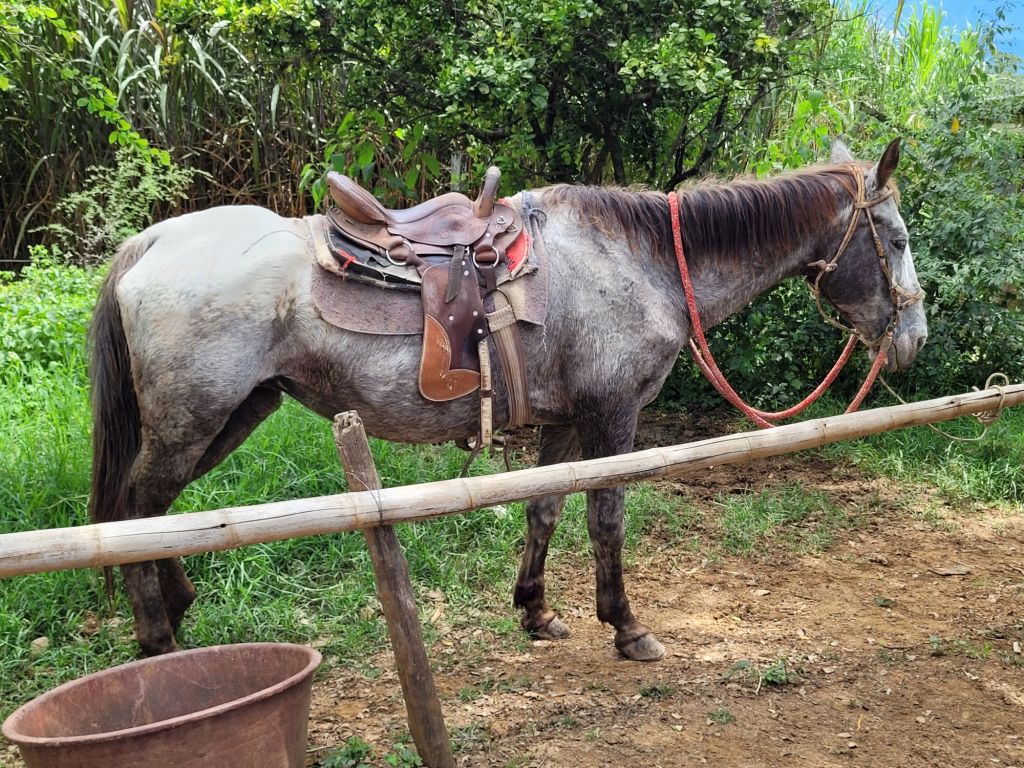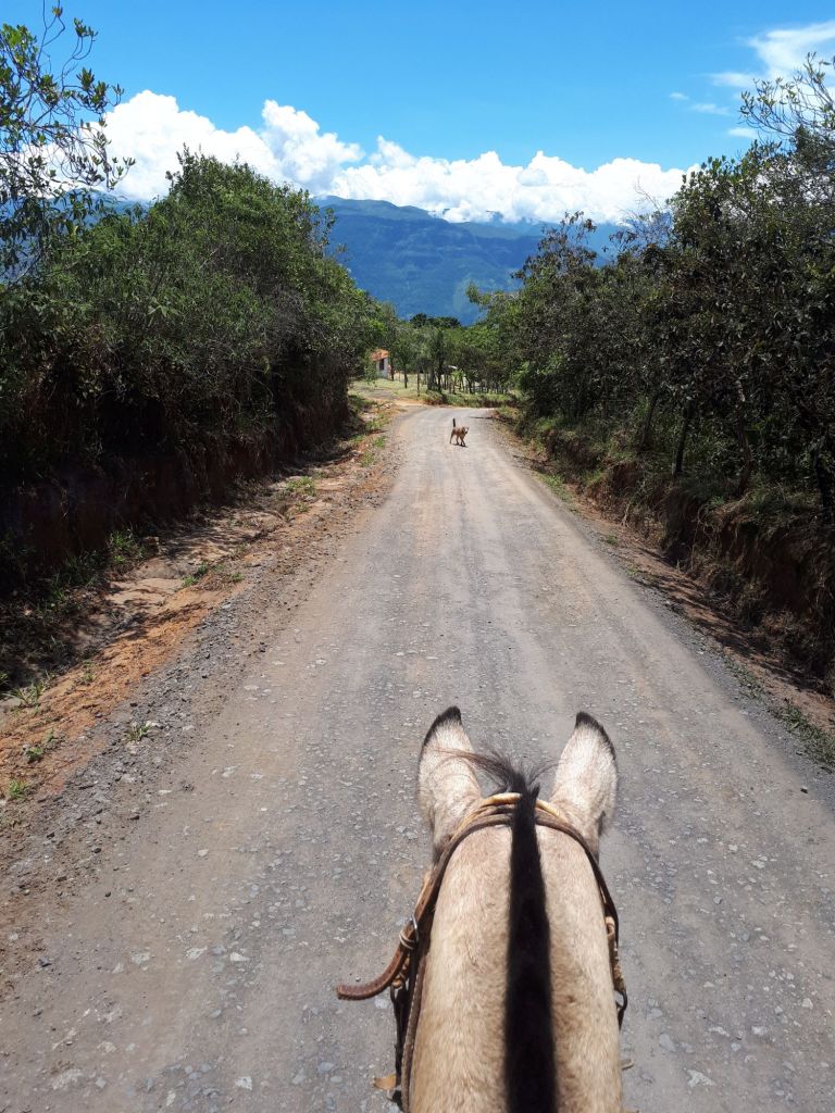 Ja, ich habe meine Eltern überreden können auch in Kolumbien eine Reittour mit mir zu machen. Wir haben die Wahl zwischen einer, zwei oder drei Stunden. Es ist die dreistündige Tour geworden. Ich habe mich natürlich riesig gefreut. Um 10 Uhr geht es los. Den Weg haben wir beschrieben bekommen. Die Straße ist nicht sehr gut, aber wir schaffen es. Es ist eben Kolumbien. Nach etwas Suchen finden wir schließlich auch die Pferde mit dem Besitzer. Als Erste bin ich dran. Natürlich bekomme ich das kleinste Pferd. Es ist ein Schimmel mit ganz vielen kleinen schwarzen Punkten und heißt Luna, was auf Spanisch Mond bedeutet. Das passt gut. Noch ein paar Änderungen am Sattel. Dann sitze ich oben.