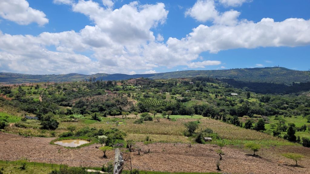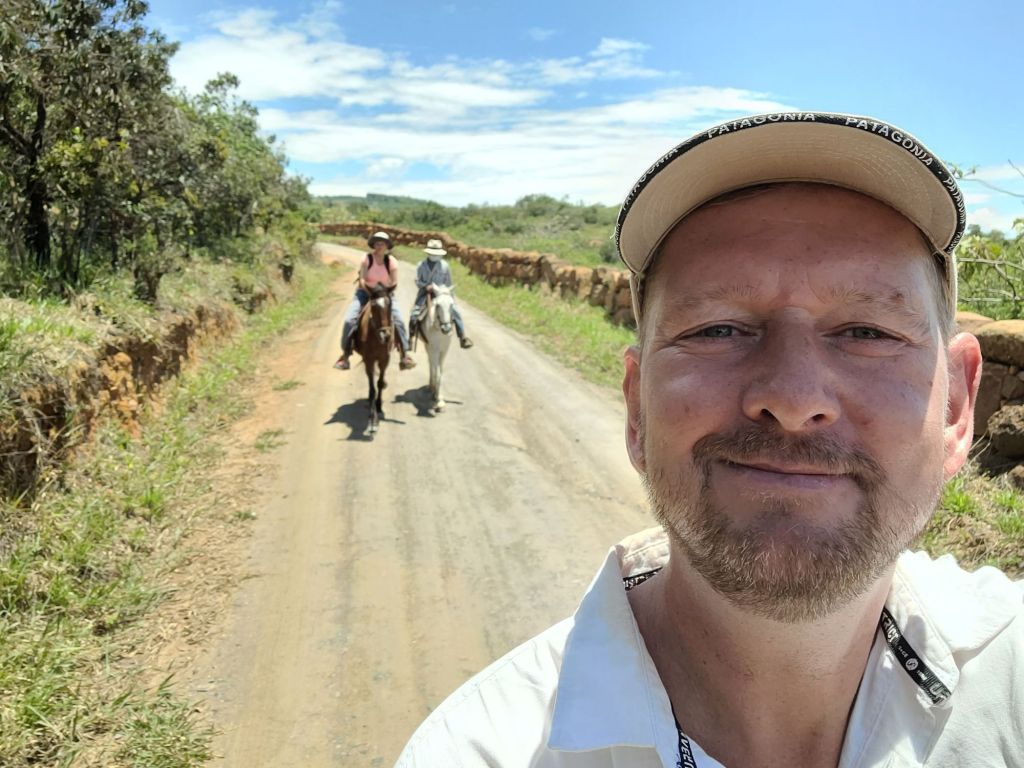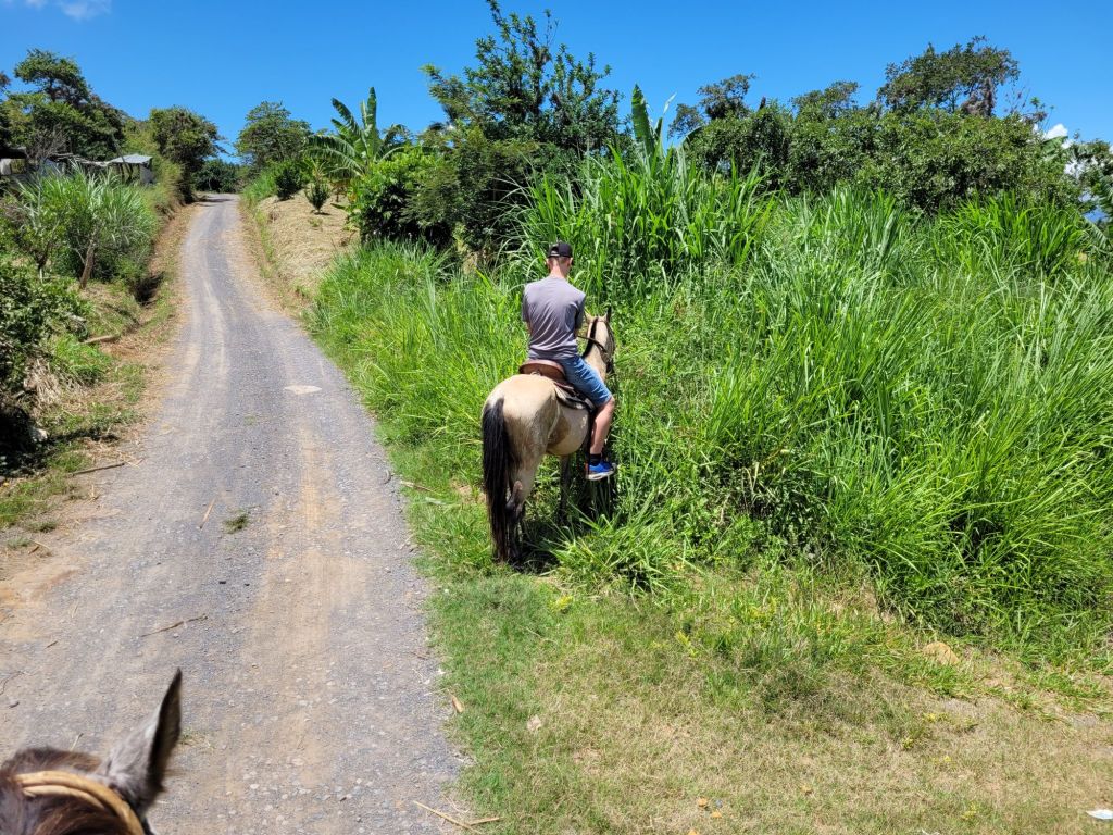 Bustero, der bisher immer hinter mir ist, versucht sich etwas vorzudrängeln und beginnt zu Traben, aber von Luna wird das nicht geduldet und schon trabt sie los, überholt Bustero geschickt und blockiert ihm dann den Weg. Samuel ist immer noch mit Son Picaso an der Spitze mit etwas Vorsprung. Da reiten wir die Straße entlang bis Son Picason beschließt etwas zu fressen, da es an den Seiten sehr viel Grass wächst, lohnt es sich bestimmt auch. Wenn einer etwas frisst, fressen gleich alle. Schon stiehlt sich auch mein Pferd an den Rand und frisst. Bustero stellt es so geschickt an, dass er mit einem Ruck den Kopf runter zieht und Mama immer die Zügel verliert. Viele Male muss der Führer helfen immer mit guten Tips auf Spanisch. Mama versteht nichts. So reiten wir und versuchen zu verhindern, dass die Pferde Grass fressen und genießen die Aussicht. Wir sind auf einen Hügel geritten und können die Berge sehen. Da es wenig Grass gibt, ist es sehr entspannt und wir können schön reiten. Es ist erdig und es geht eine kleine Stelle ziemlich steil bergan, da rutscht Dakota mit Papa aus und fällt auf die Knie, aber zum Glück richtet sie sich schnell wieder auf und wir können weiter.