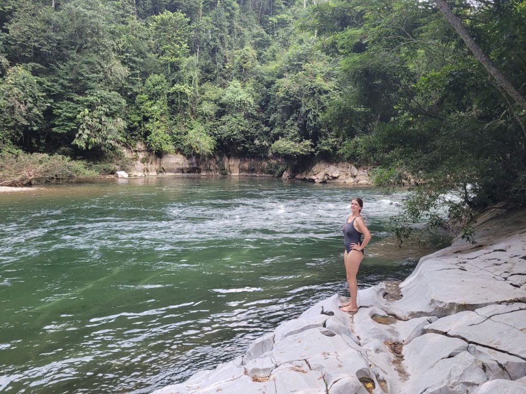 Der namensgebende, von teils sehr beeindruckenden Kalksteinformationen umgebende Río Claro präsentiert sich bei unserer Ankunft tatsächlich sehr klar. Und dank des Skippers Fahrstil bleibt ausreichend Zeit, gleich noch in den Fluss zu hüpfen. In der Mitte ist die Strömung nicht zu verachten, trotzdem erreichen wir auch das gegenüberliegende Ufer. Zur Not sind flussabwärts der Badestelle aber auch noch Seile gespannt.