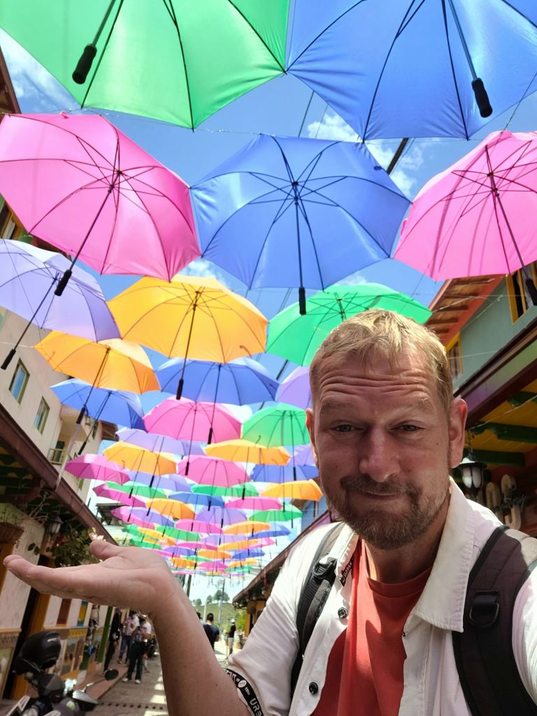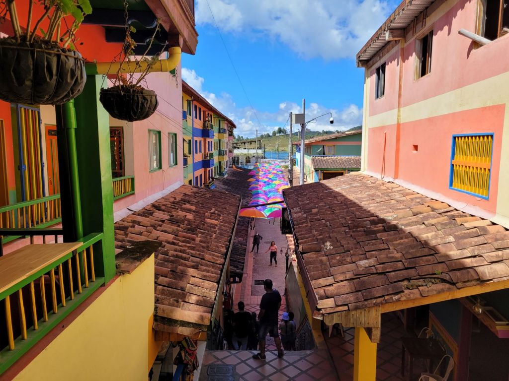 In einer besonders herausgeputzten Gasse stellt sich dann die übertragene Frage nach der Henne und dem Ei. Wieder einmal gehen wir im Schatten über uns aufgehängter Regenschirme. Cartagena rühmt sich dessen in Getsemaní, auch in anderen Orten unserer kleinen Rundreise haben wir sowas schon in kleinem Maßstab gesehen und nun also hier in Guatapé. Es wird sich wohl nie abschließend klären lassen, wer die Idee zuerst hatte und ob das überhaupt ein Kolumbianer war.