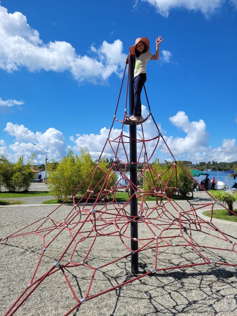 Nach dem Dorfrundgang und dem obligatorischen Besuch von Andenkenläden, wobei Maila ihre immer noch heißgeliebte Tasche findet, schlendern wir noch etwas am Ufer entlang. Ein kleines Klettergerüst weckt Jugenderinnerungen des Skippers. Arbeitslose Touristenboote reihen sich aneinander. Mehrmals werden wir auf Seerundfahrten angesprochen, aber als Segler hat das dann doch nur einen geringen Reiz. Bald machen wir uns auf den Rückweg nach Medellín.