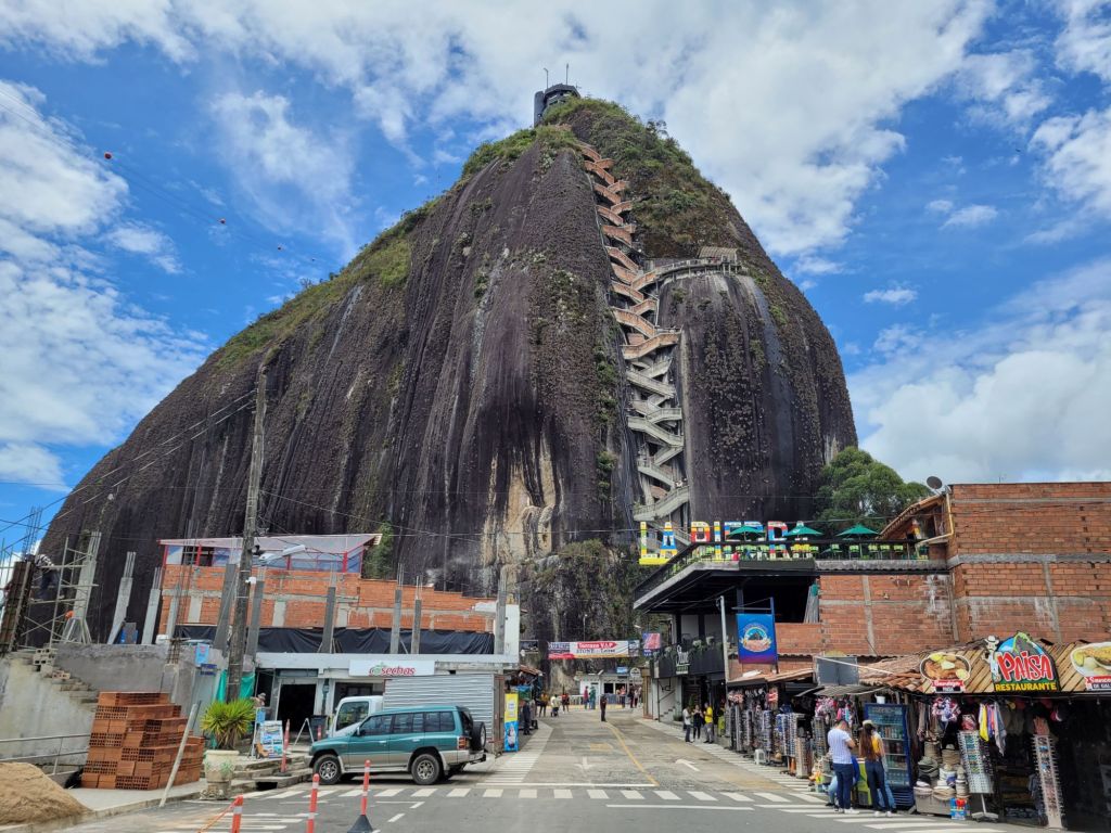 Das erste Ziel ist der Fels von Guatapé. Mitten in der zwar hügeligen, an herausragenden Landmarken jedoch eher armen Landschaft ragt unvermittelt ein wie von einem Titan dort fallengelassener Stein in die Höhe. 220m erhebt sich der Granit über seinen Fuß, insgesamt bis auf 2.137m über Normalnull.