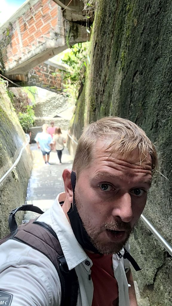 Die Felsspalten sind sicher ein Leckerbissen für Kletterer. Das wäre aus touristischer Sicht allerdings suboptimal. Folgerichtig hat man in eine davon eine Treppe gebaut. Ach was, es sind derer gleich zwei. Eine führt hinauf, die andere wieder herunter. Mithin kann nun auch der ungeübte Alpinist vielleicht nicht mühelos, aber doch mit absehbaren Aufwand die 659 Stufen bis zum Gipfel erklimmen. Machen wir natürlich auch.