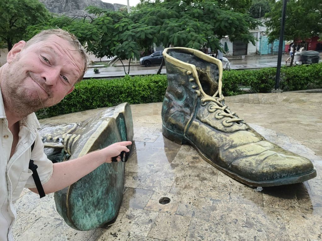 Auf dem Rückweg werfen wir noch einen Blick in das provisorische Goldmuseum der Stadt und machen einen Abstecher zu „Los Zapatos Viejos“. Diese fast 65 Jahre alten, ausgelatschen Stiefel aus Bronze sind eine Hommage an den sehr beliebten lokalen Dichter Luis Carlos López, der in der ersten Hälfte des 20. Jahrhunderts nicht nur, aber besonders auch seiner Heimat(stadt) ein literarisches Denkmal setzt. Bei unserem Besuch im benachbarten Castillo de San Felipe hatten wir diesen touristischen Pflichttermin verpasst. So posiert die Familie nun halt nicht bei strahlender Sonne, sondern leichtem Nieselregen für die obligatorischen Fotos.