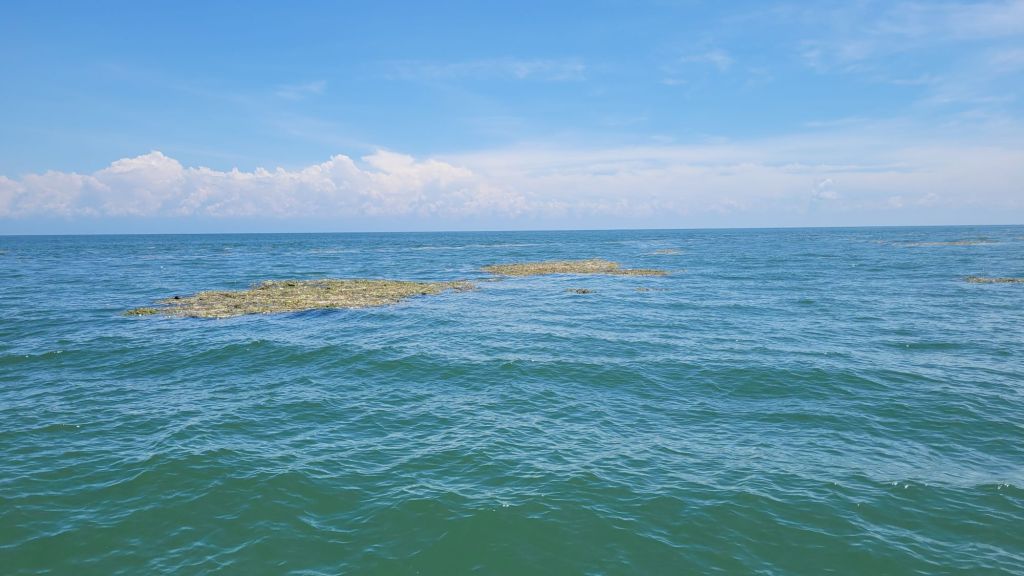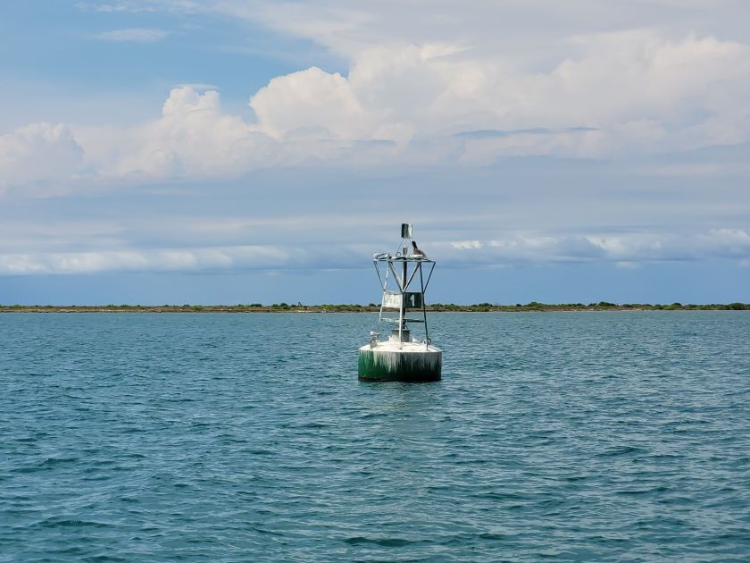 Dazu kommt ein großer, flacher Bereich östlich der Mündung. Wir haben keinen ausgeprägten Wellengang und wollen den Umweg gering halten. Doch dann sehen wir schon von weitem bis weit vor die Küste reichende Brecher voraus. Spontan vergrößern wir den Sicherheitsabstand. Dabei hilft der Fluss kräftig mit. Trotz wie üblich ungenauer Logge verzeichnen wir über drei Knoten Seitenstrom. Hat im Landesinnern wohl nicht viel geregnet?! Wir sind nicht böse. Die See wird auch so schon erstaunlich unangenehm. So schaukeln und strömen wir uns also an den Grünflächen vorbei und sehnen uns nach ruhigerer Gewässern.