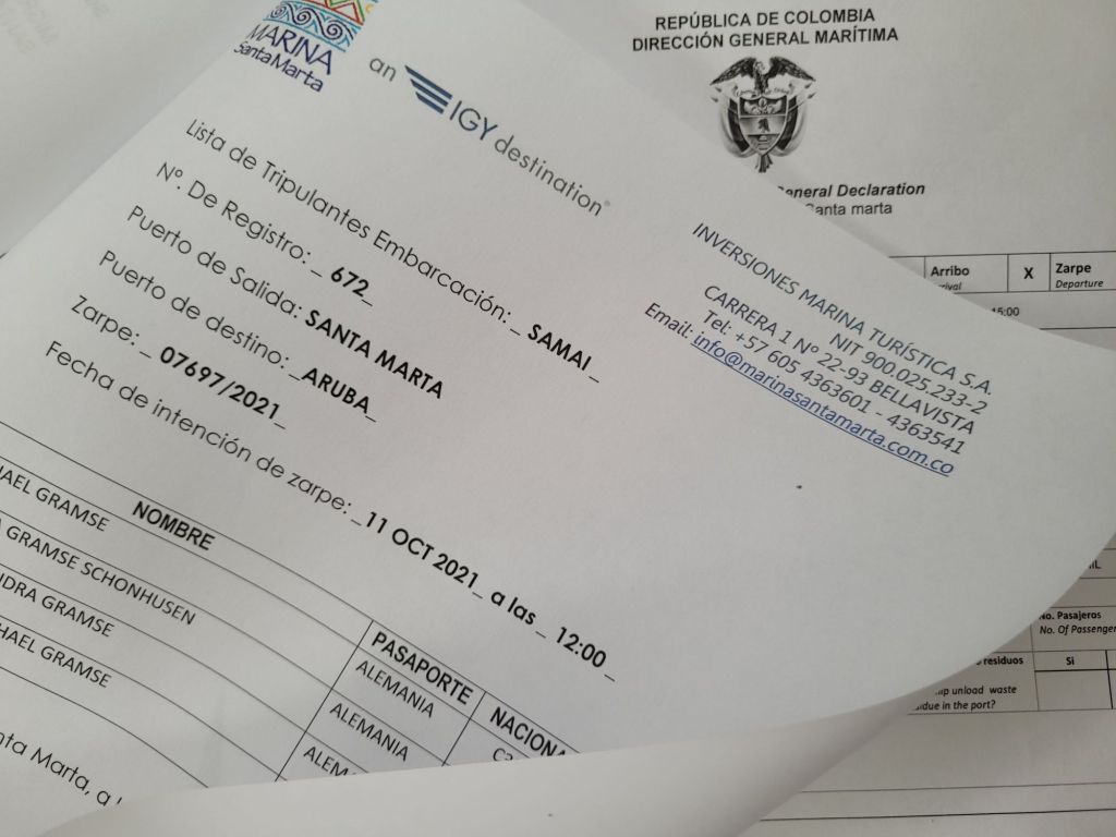 Vor der Abfahrt müssen wir unserem Agenten Schiffspapiere, Crewliste, Pässe, das internationale Zarpe und unsere geplante Ankunftszeit (ETA) schicken. Damit meldet er uns bei den Behörden an. In Cartagena angekommen, gestalten sich die Formalitäten für uns denkbar einfach. Noch am gleichen Abend holt José die Pässe ab und bringt sie am nächsten Morgen frisch gestempelt wieder. Ich unterschreibe ihm ein paar Papiere. Danach kümmert er sich um den „temporären Import“ unserer Samai. Damit ist auch schon alles erledigt. Ach ja… ein wie auch immer gearteter, auf die Gesundheit zielender Test ist nicht nötig! Einige Tage später bekomme ich alle Unterlagen pragmatisch über WhatApp aufs Handy.