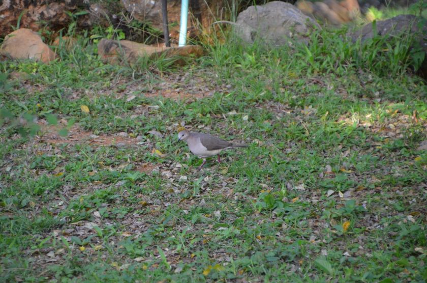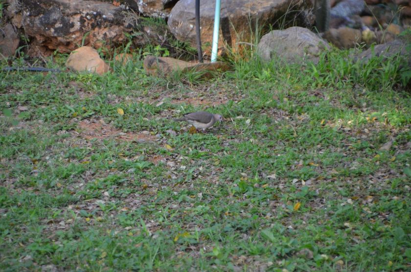 Eine Blauringtaube läuft hier jeden Morgen und eigentlich den größten Teil des Tages auf dem Gelände umher und sucht Samen und/oder Früchte. Der blaue Ring um das Auge ist bei dieser Taube namengebend.