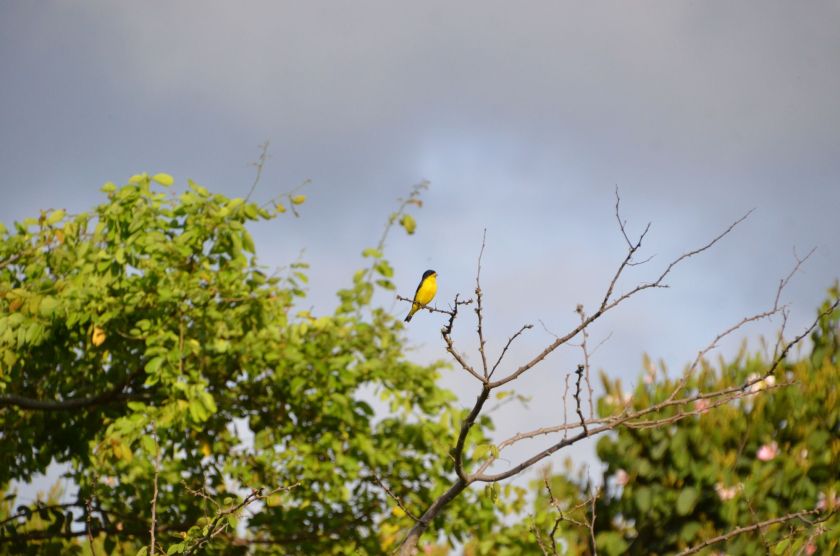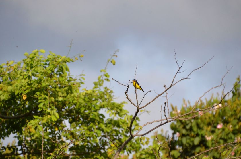 Jeden Morgen bekomme ich von Katja einen Tee, um mich bei der anfänglichen Kälte etwas zu wärmen. Auch Mama ist dabei und schaut zu. Am zweiten Tag fliegt ein Vogel mit schwarzem Oberkörper, einem kleinen weißen Fleck an den Flügeln und einem knallig gelbem Bauch auf einen nahe stehenden Baum. Es handelt sich um einen männlichen Mexikozeisig. (ein seltsamer Name, ich weiß!)