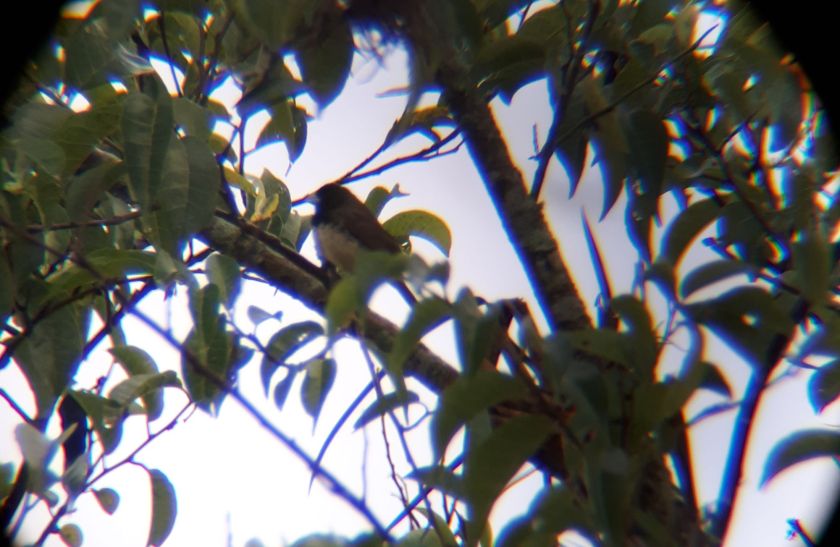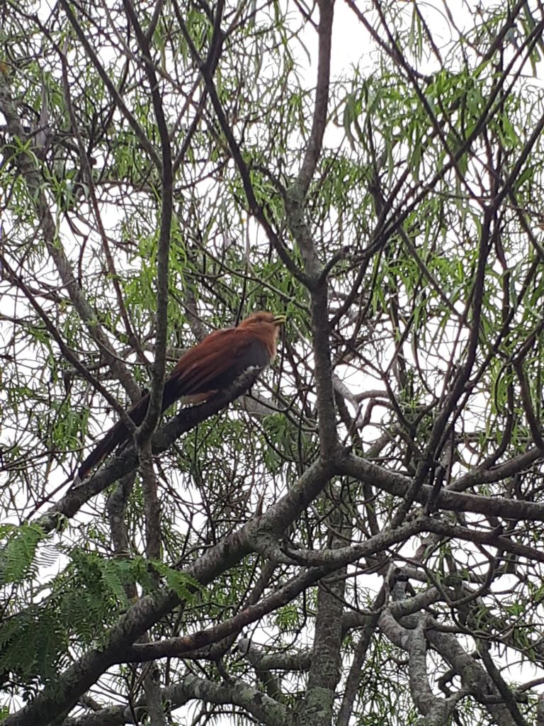 Am zweiten Tag taucht plötzlich noch ein großer brauner Vogel mit grauem Bauch auf. Er sitzt in dem großen Baum, in dem ich die meisten Vögel sehe, nur leider zu gut versteckt. Katja weiß, dass der Vogel auf Englich Squirrel Cukoo heißt. Im Deutschen nennt man ihn, wie ich herausgefunden habe, Eichhornkuckuck. Um Bilder von ihm zu machen, laufe ich dem hüpfendem Vogel hinterher. Ja, nicht verlesen! Dieser Vogel hüpft gern von Ast zu Ast. Und das tut er recht häufig und ist auch gut darin, weshalb ich ihn solange gejagt habe wie möglich.