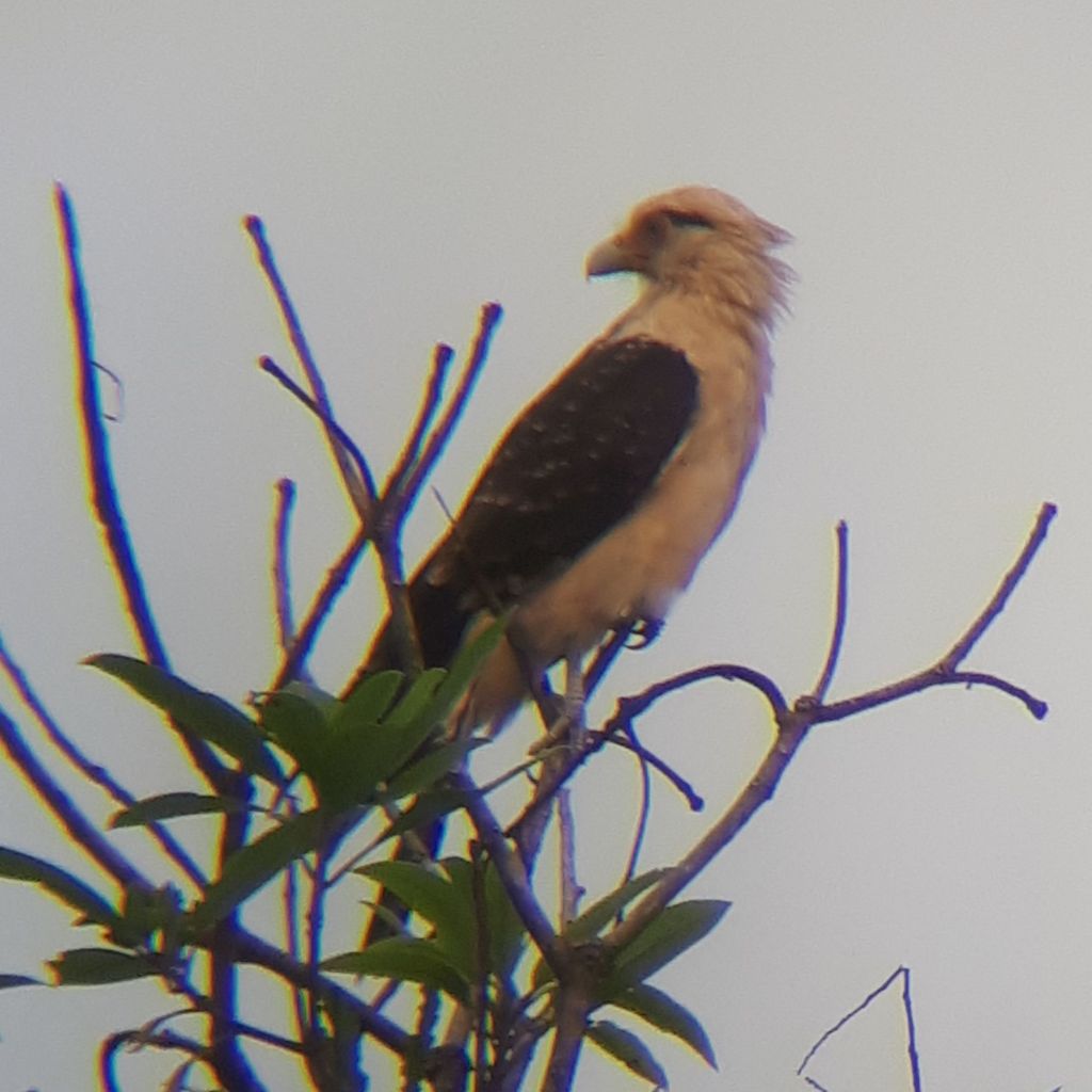 Es gab natürlich auch alte Bekannte zu sehen. Der schon in Panama zuerst von Maila gesichtete Gelbkopfkarakara setzte sich auf einen bewachsenen Ast direkt vor den Himmel. Das Motiv war perfekt! Der Vogel war super anzusehen und blieb auch fast 10 Minuten dort sitzen. Ein Schwarm grüner Papageien, wahrscheinlich Tovisittiche, versteckte sich dagegen lieber laut krächzend in den Bäumen. Den schönen Liktormaskentyrann haben wir auch schon ein paarmal gesehen. Und Dann sehe ich noch einen mysteriösen Vogel mehrere hundert Meter entfernt auf einem Baum landen. Mit meinem Fernglas sehe ich ihn zwar, erkenne aber nur die Umrisse. Er sitzt genau mit dem Licht im Rücken. Keine Ahnung, was das für ein Vogel ist. Aber es sah trotzdem toll aus.