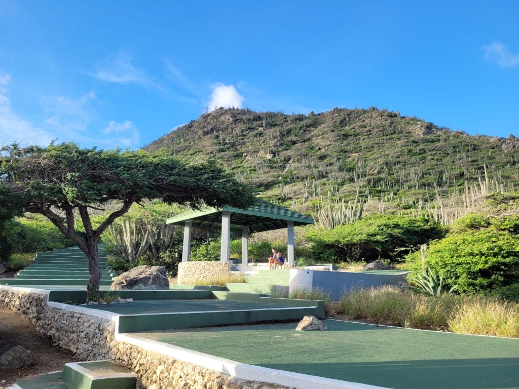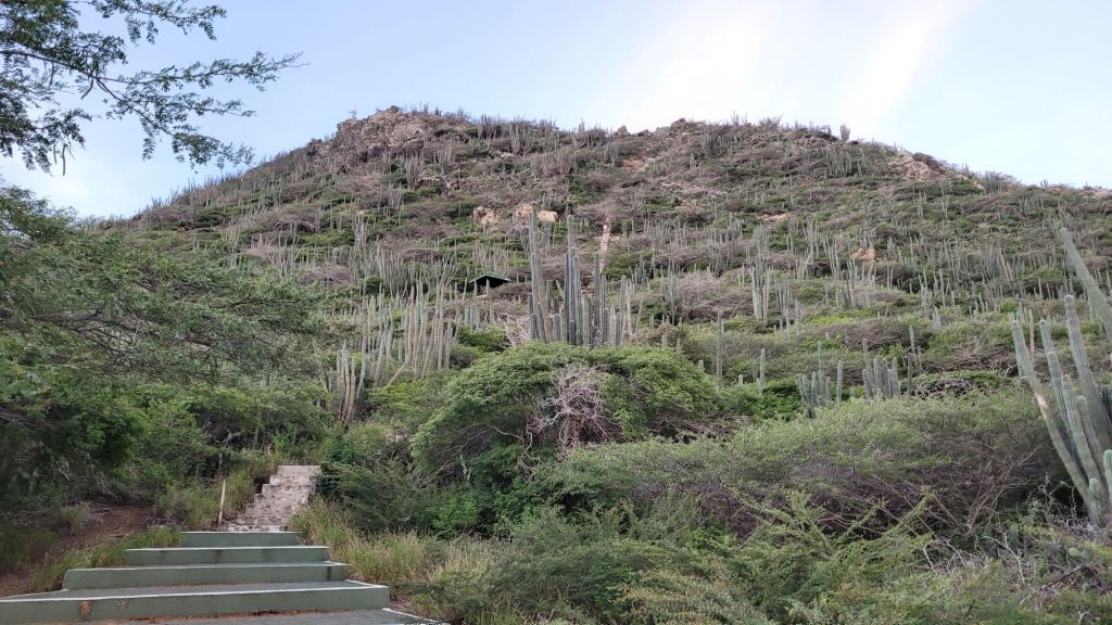 Es gibt auf Aruba eine sehr markante Erhebung: den Hooiberg. Monolithisch überragt er mit seinen 165m die Ebene und ist – je nach Quelle – doch nur die zweit- oder dritthöchste Erhebung der Insel. Da müssen wir natürlich rauf! Dabei bietet sich die noch vergleichsweise kühle Morgenstunde an. Wir quälen uns also noch vor Sonnenaufgang aus den Betten und machen uns auf den Weg.