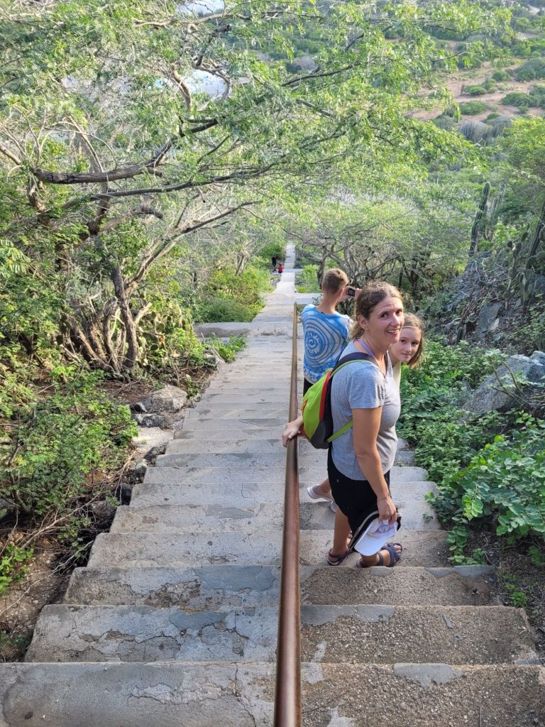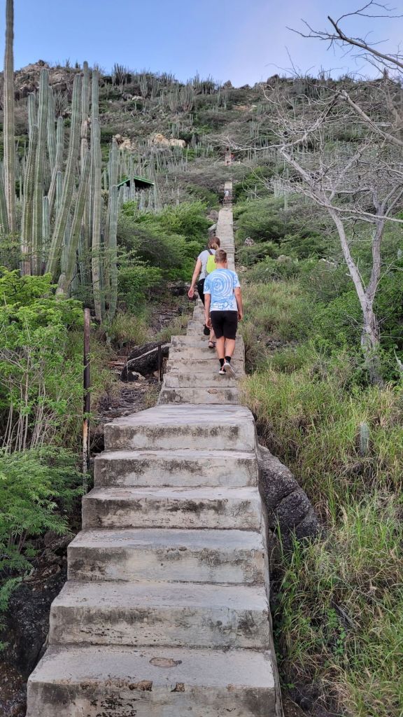 Der Parkplatz ist recht gut gefüllt. Einige Frühsportler meiden die heiße Mittagssonne ebenso wie wir und gehen stoisch treppauf und treppab. Richtig gelesen. Der Hooiberg ist mit einer langen Treppe versehen. Nur schlappe 562 Stufen bis zum Gipfel. Auf geht es!