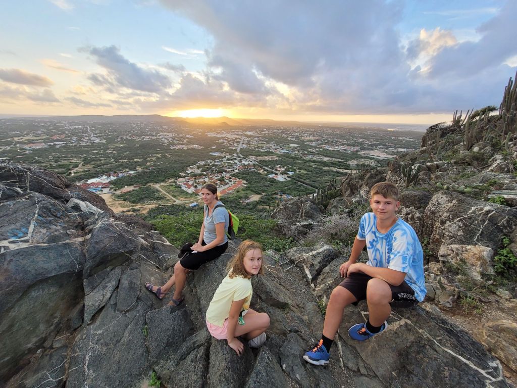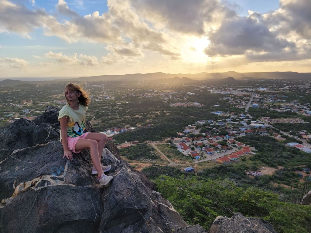 Die Rangfolge der Atemlosigkeit entspricht weitgehend der Altersstruktur der Familie. Doch die Mühe lohnt sich. Der Blick reicht fast über die gesamte, in warmes Morgenlicht getauchte Insel. Im Süden begrenzen nur die Hügel des Nationalparks Arikok die Sicht. Im Norden erkennen wir Oranjestad, natürlich auch die Hotelburgen sowie das California Lighthouse.