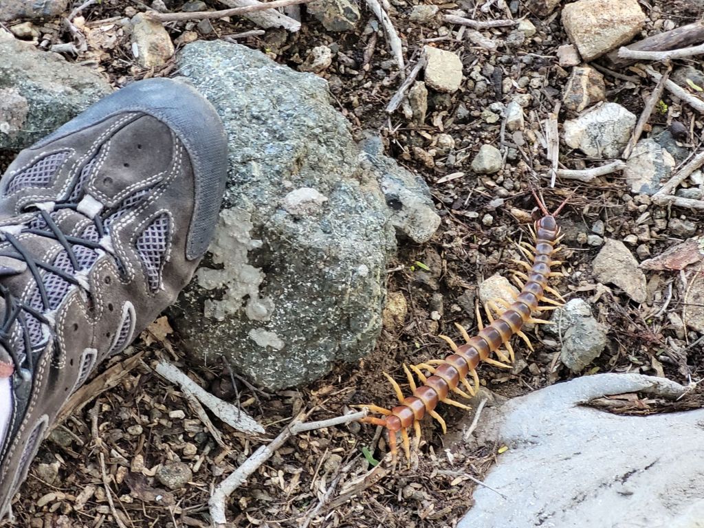 Und dann entdecken wir einen Brasilianischen Riesenläufer (Scolopendra gigantea). Der kommt in Brasilien aber lustiger Weise gar nicht vor. Mit bis zu 30cm ist es der größte Vertreter der Hundertfüßer-Familie. Sein giftiger Biss ist schmerzhaft, aber für Menschen normalerweise nicht tödlich. Trotzdem zeigen wir Respekt.